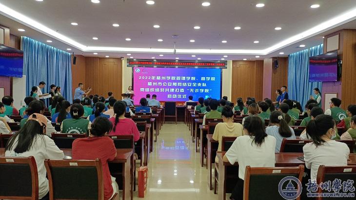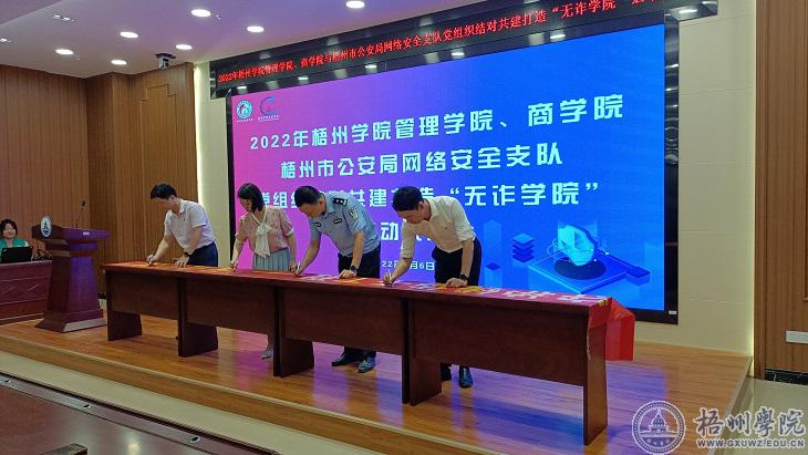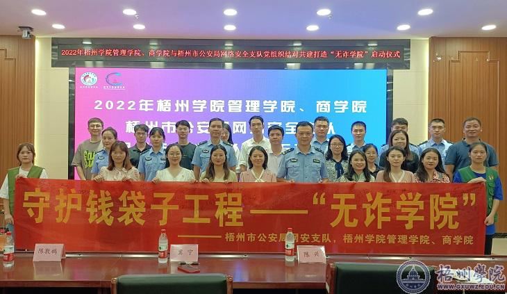 为贯彻落实自治区教育厅在广大师生中开展防范电信网络诈骗宣传教育的要求,增强广大师生防范电信诈骗的意识和能力,7月6日,管理学院党委、商学院党委联合梧州市公安局网安支队党支部在明科楼一楼多功能报告厅举办党组织结对共建,打造“无诈学院”启动仪式。管理学院党委书记冀宁,党委副书记陈兴,商学院党委副书记叶子琛,梧州市公安局网安支队政委陈敦鹄出席启动仪式。公安局网安支队成员以及管理学院、商学院全体辅导员、学生代表参加了会议。