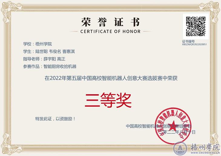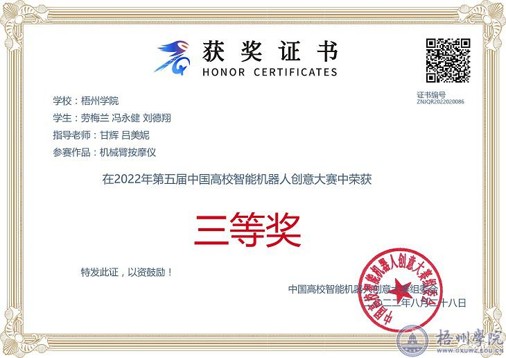 本次大赛的选拔赛、决赛采用了线上选拔方式。我校共派出5组队伍,历经选拔赛、决赛两个阶段,有两支队伍脱颖而出。其中,我校的甘辉、吕美妮教师指导的劳梅兰、冯永健、刘德翔同学作品《机器臂按摩仪》历经第一阶段的广西赛区选拔赛和第二阶段的全国赛,最终获得全国三等奖。薛宇阳、高正教师指导的陆世聪、韦俊名、曹惠淇同学小组作品《智能厨房收拾机器》获得广西赛区三等奖。
