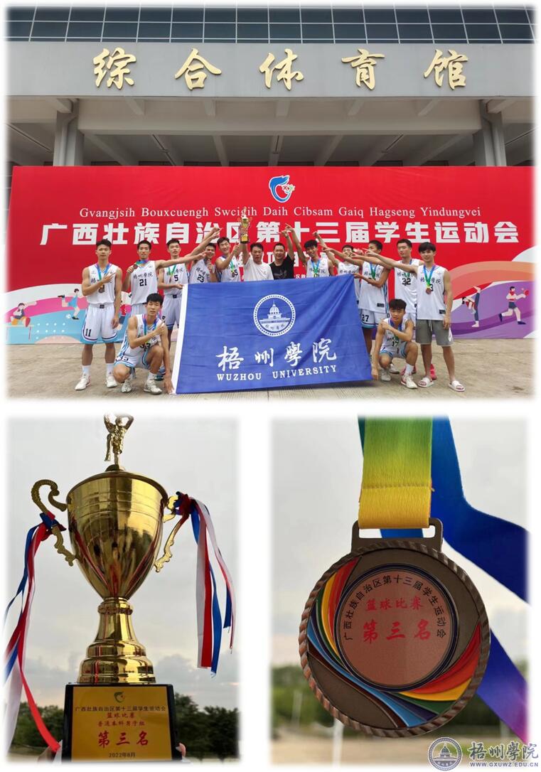 男子篮球队参加的是普通本科组的比赛,第一阶段18支代表队分为四个小组进行小组循环赛,小组前二名出线,梧州学院男子篮球队以3胜1负的成绩小组第二出线进入八强,第二阶段进行的是交叉赛,经过教练组的赛前的动员及对战术的合理安排、运动员场上的顽强拼搏、拼体能、拼意志、拼团队配合以及教练员对运动员上场时间的合理调配,最终通过加时赛以81:77艰难战胜老牌劲旅广西科技大学挺进四强,在季军争夺战中主力队员带伤上场,激发了全队的顽强斗志,最终以73:59战胜黑马广西城市职业大学队,荣获广西第十三届学运会普通本科组篮球比赛第三名。