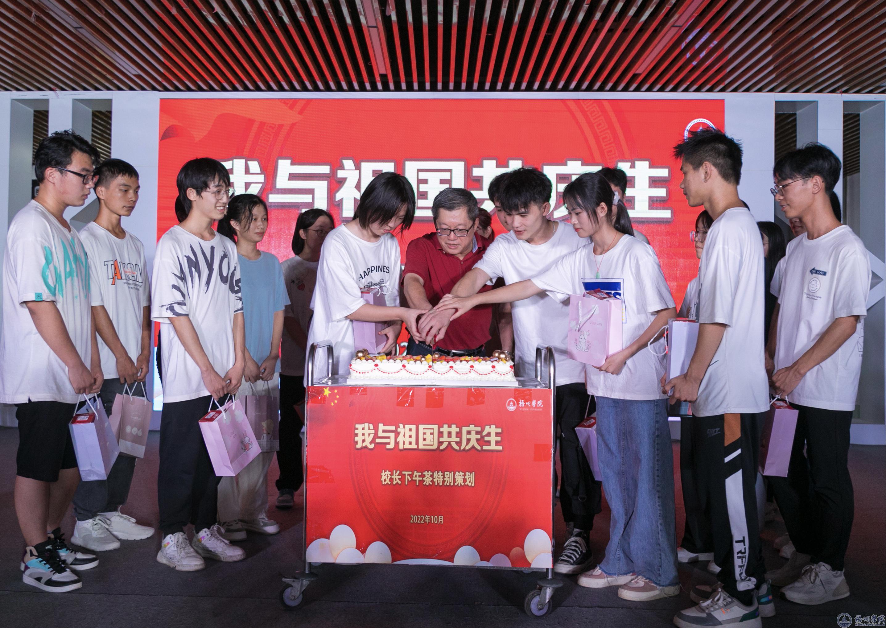 10月1日晚,学校在体育馆负一楼举办了“我与祖国共庆生”校长下午茶特别策划活动。学校校长杨奔、副校长范生汝与学生工作部(处)、校团委、国际交流处、各二级学院负责人以及师生代表欢聚一堂,共同庆祝中华人民共和国成立73周年。