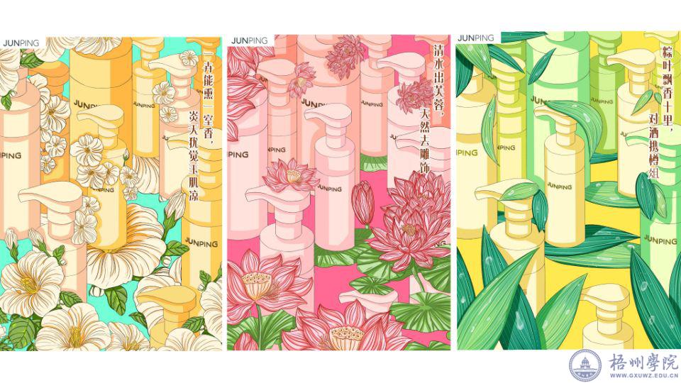 单丝不成线,独木不成林。白昕冉觉得不能单打独斗,便和几位要好的舍友围在一块讨论,四人你一言我一语,抛出各自的想法,一场讨论下来,她原先没有头绪的命题已渐渐有了眉目。俊平企业的命题《中国香气》也在其中。此时的她,未曾想过这个命题将给她带来哪些意外。“这是一款女性洗面奶,我打算采用色彩清新亮丽的色调,以体现女性美”。白昕冉说道。而命题《中国香气》,一开始她并没有想到具有代表性的味道。在冥思苦想下,她终于联想到富有中国味道的三种植物:茉莉、荷花与粽叶。
