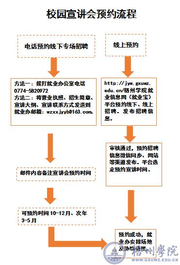 4.用人单位招聘信息发布可以随时拨打0774-5820972招聘热线与就业办公室联系,也可直接将招聘信息编辑好后发到就业招聘邮箱:wzxyjyb@163.com或登录我校就业信息官网就业宝系统注册发布。