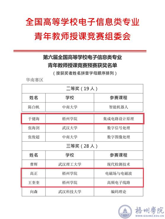 近日,由教育部高等学校电子信息类专业教学指导委员会举办的“第六届全国高等学校电子信息类专业青年教师授课竞赛预赛”顺利落下帷幕。经过网络匿名评审、网站公示、组委会审定,我校电子与信息工程学院参赛教师于健海荣获华南赛区二等奖,王奎奎、高正荣获华南赛区三等奖,是全区获奖等级最高、获奖数量最多的高校。