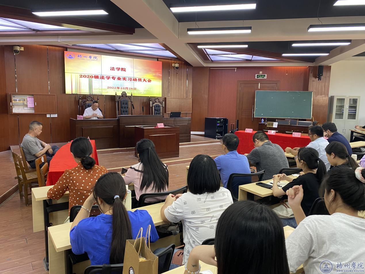10月28日下午,法学院在模拟法庭举行2020级法学专业实习动员大会。学院领导、部分教师代表以及2020级全体法学专业学生参加会议。 动员会上,院长骆庆国教授从三个方面就实习工作进行了强调,首先是安全第一;其次是模范遵守实习单位工作纪律,展现梧州学院大学生良好的精神风貌和职业素养;第三是坚决完成学院和实习单位交付的各项实习任务,高质量完成实习方案所确定的各项指标。 何剑副书记告诫同学们,在实习期间遇到问题要客观面对,树立良好的心态。始终保持谦虚、守时、认真的工作态度。 据悉,此次实习,将持续2个月。 [文/图:廖思美]