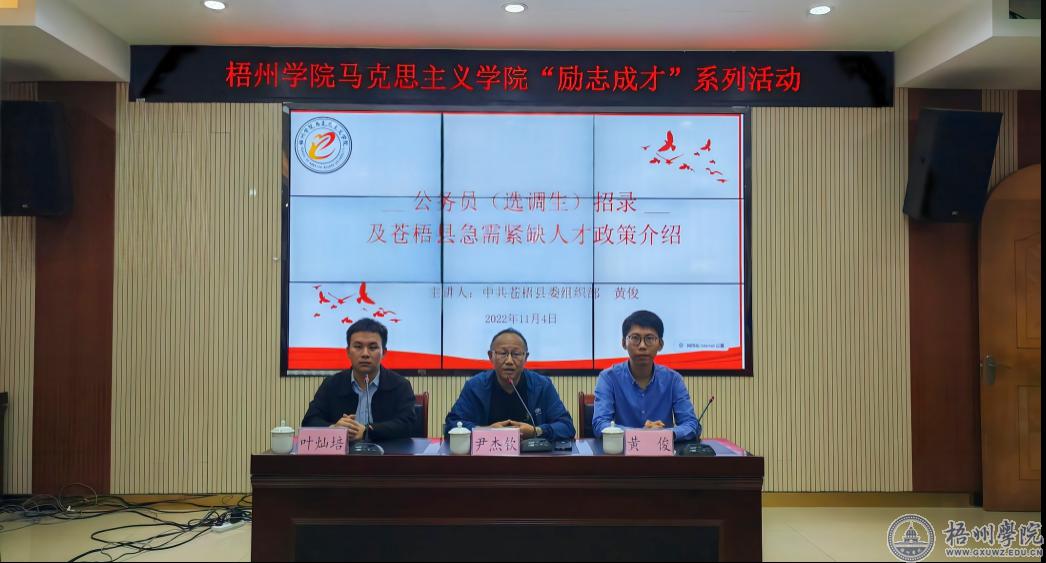 11月4日晚,马克思主义学院在明理楼七楼视频会议室举办“励志成才”系列活动。苍梧县委组织部副部长、公务员局局长(兼) ,老干部局局长(兼)黄俊,苍梧县组织部干部、马院2015级哲学专业毕业生叶灿培应邀出席,活动由院长尹杰钦主持,马克思主义学院师生代表参加了会议。