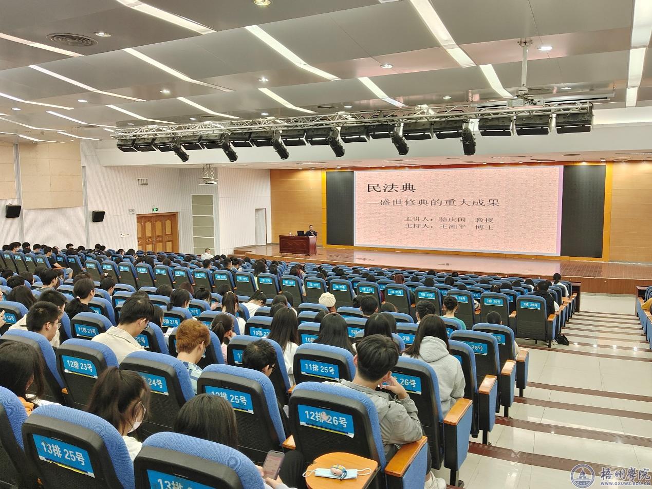 11月4日晚,法学院在明理楼学术报告厅举办了“法治大讲堂”系列讲座第4期。讲座由法学院院长骆庆国教授开讲,王湘平博士主持,法学院2021、2022级法学专业全体同学和部分教师参加。 骆庆国教授以“民法典——盛世修典的重大成果”为主题,以“历程、地位、特点”三个关键词为切入点,讲述了新中国民法典在编纂过程为什么要坚持创新性;阐释了新中国民法典在我国社会主义法律体系中为什么具有基础性;回答了新中国民法典为什么具有鲜明的人民性。 讲座对同学们进一步理解、领悟《中华人民共和国民法典》具有重要的指导作用。 [文/图:李明宇]