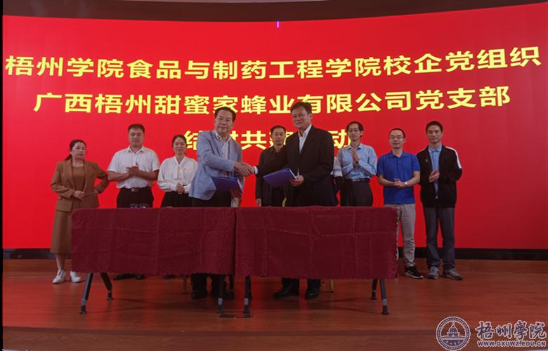 校企两家单位负责人共同签订党组织结对共建协议。陈金辉书记给两个党组织党员上了题为“以中国式现代化全面推进中华民族伟大复兴”的党课。甜蜜家蜂业有限公司董事长黄忠连介绍了广西梧州甜蜜家蜂业有限公司基本情况,蜂蜜在食品领域的应用,结合广西特色的壮药、瑶药及蜂蜜植物来源在制药方向的发展可能做了探讨。