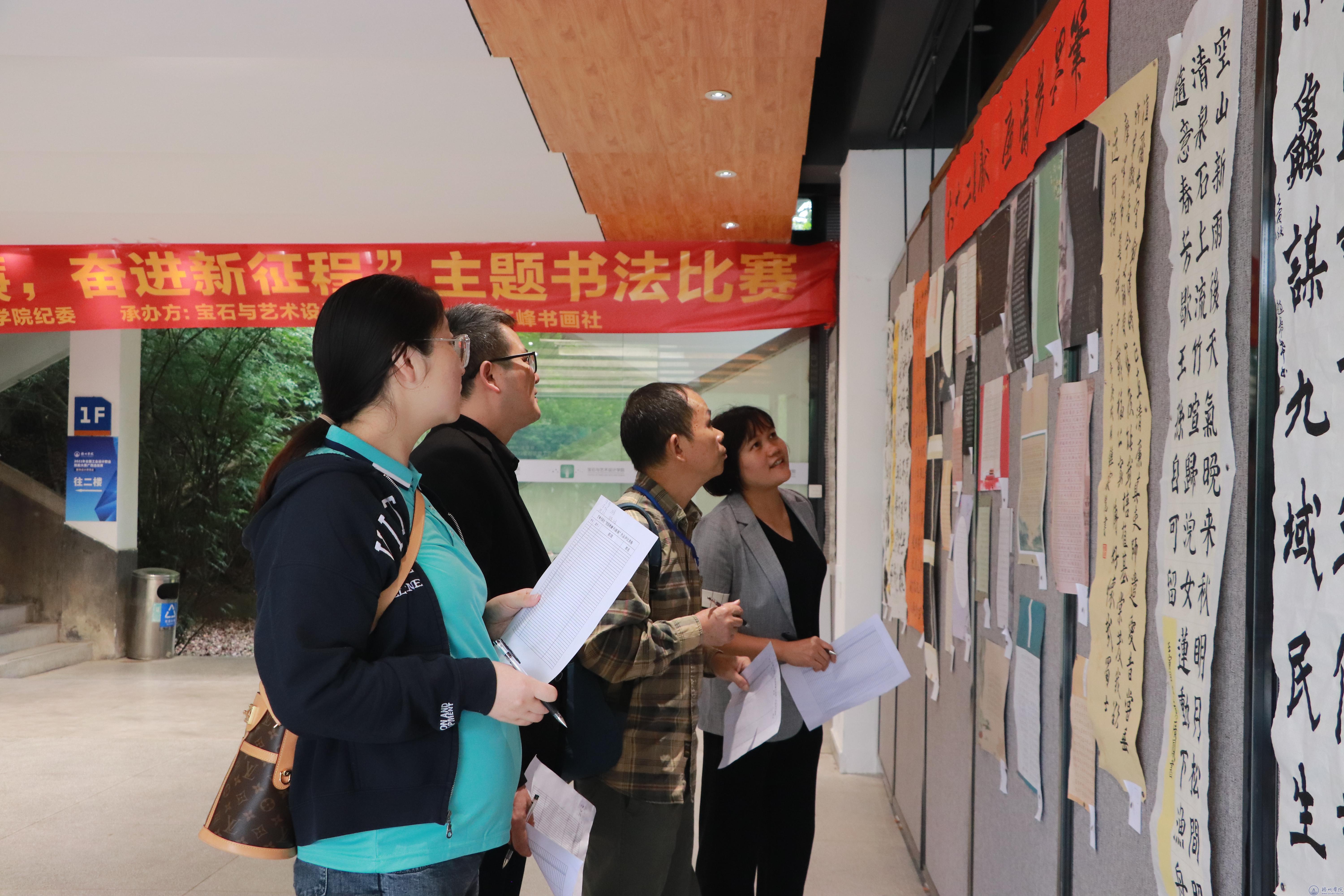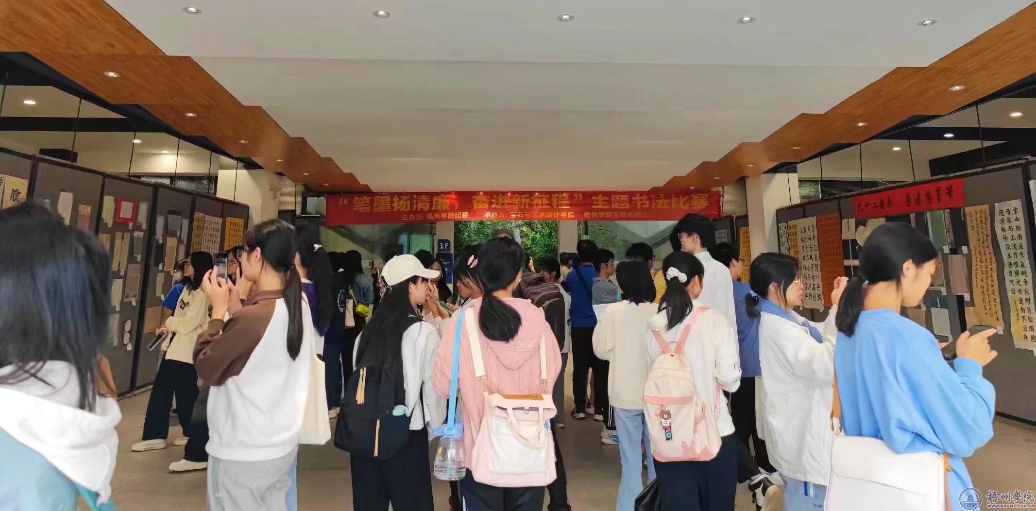 为让我校大学生感受汉字与书法的魅力,提高汉字书写能力,传播清廉文化、弘扬时代主旋律,10月10日-11月9日期间,由梧州学院纪委主办,宝石与艺术设计学院、梧州学院艺峰书画社承办主题为“笔墨扬清廉,奋进新征程”书法比赛。本次比赛面向全校12个二级学院全日制在校生,收到共计895幅作品,其中99幅作品包括楷书90幅、行书6幅、草书2幅、小篆1幅。经过初筛,于11月3日-11月9日期间在实验楼一楼展厅进行展览,吸引了很多师生前来观看。11月8日,学校纪委书记梁业华到展览现场参观指导。11月9日上午,由学校纪委、宝石与艺术设计学院组织专人通过现场评选的方式评选出优秀作品。