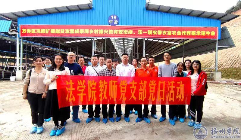 11月16日,梧州学院法学院教师党支部与梧州湖南商会党支部联合举办“学习党的二十大报告精神”党员日活动。两个党支部的党员一起参观、考察梧州市乡村振兴示范项目——乐一投资集团有限公司思良江牛场。在湖南商会党支部活动室举行“二十大报告精神”学习座谈会,就二十大报告的精神,结合乡村振兴、法律教育学习、校企合作等方面进行广泛的交流。 [文:王湘平/图:孙豆]