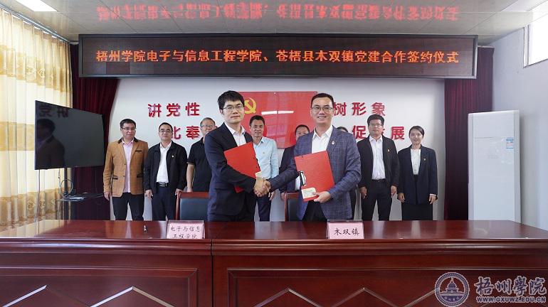 为深入学习贯彻落实党的二十大报告提出的“全面推进乡村振兴,坚持农业农村优先发展,巩固拓展脱贫攻坚成果,加快建设农业强国,扎实推动乡村产业、人才、文化、生态、组织振兴”精神,以党建为引领,探索合作共建之路,助力乡村振兴。11月23日,电子与信息工程学院党委与苍梧县木双镇党委举行党建共建签约仪式。学校党委常委,组织部、统战部部长黄健武,电子与信息工程学院党委书记邓小林、院长张文祥,木双镇党委副书记、镇长黎明靖及双方代表出席签约仪式。