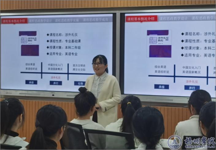 展示活动中,曾秦老师介绍了《涉外礼仪》课程的基本情况、教学设计、教学实施、教学成效等环节,详细阐述了思政元素融入教学设计和实施的方法与途径,以“Lesson 3 General Rules”课堂为例,充分利用“学习通”等教学平台和多媒体设备,运用案例分析、分组讨论、角色扮演、课堂练习等多种教学方法,演示了《涉外礼仪》课程的教学过程。