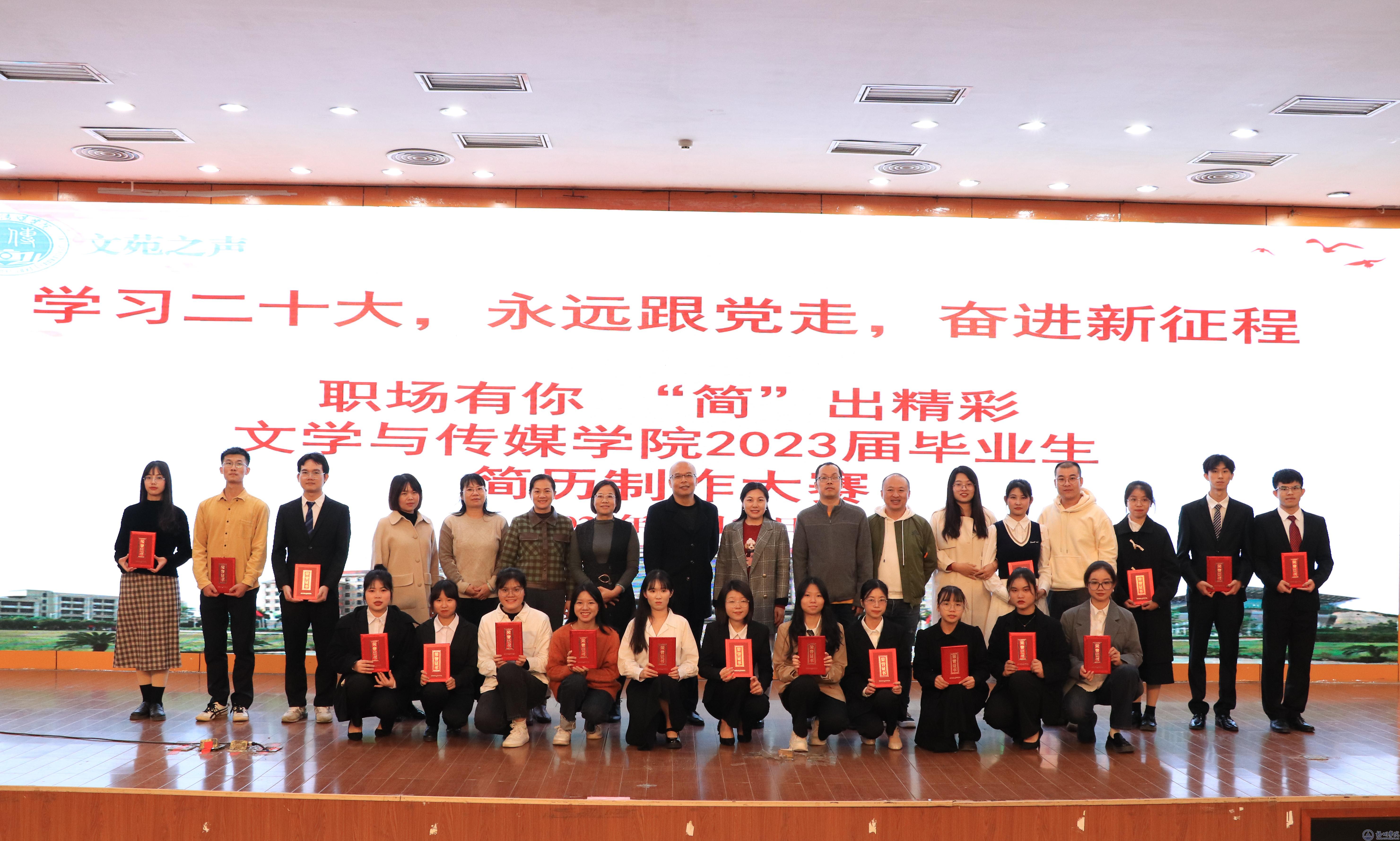 11月30日下午,文学与传媒学院在明理楼一楼学术报告厅举办了文苑之声“学习二十大,永远跟党走,奋进新征程——职场有你,‘简’出精彩”——2023届毕业生简历制作大赛。学院党委书记梁宏云、党委副书记龚红梅、毕业班班主任、全体辅导员、19级全体毕业生和20级、21级学生代表近250人观看比赛。