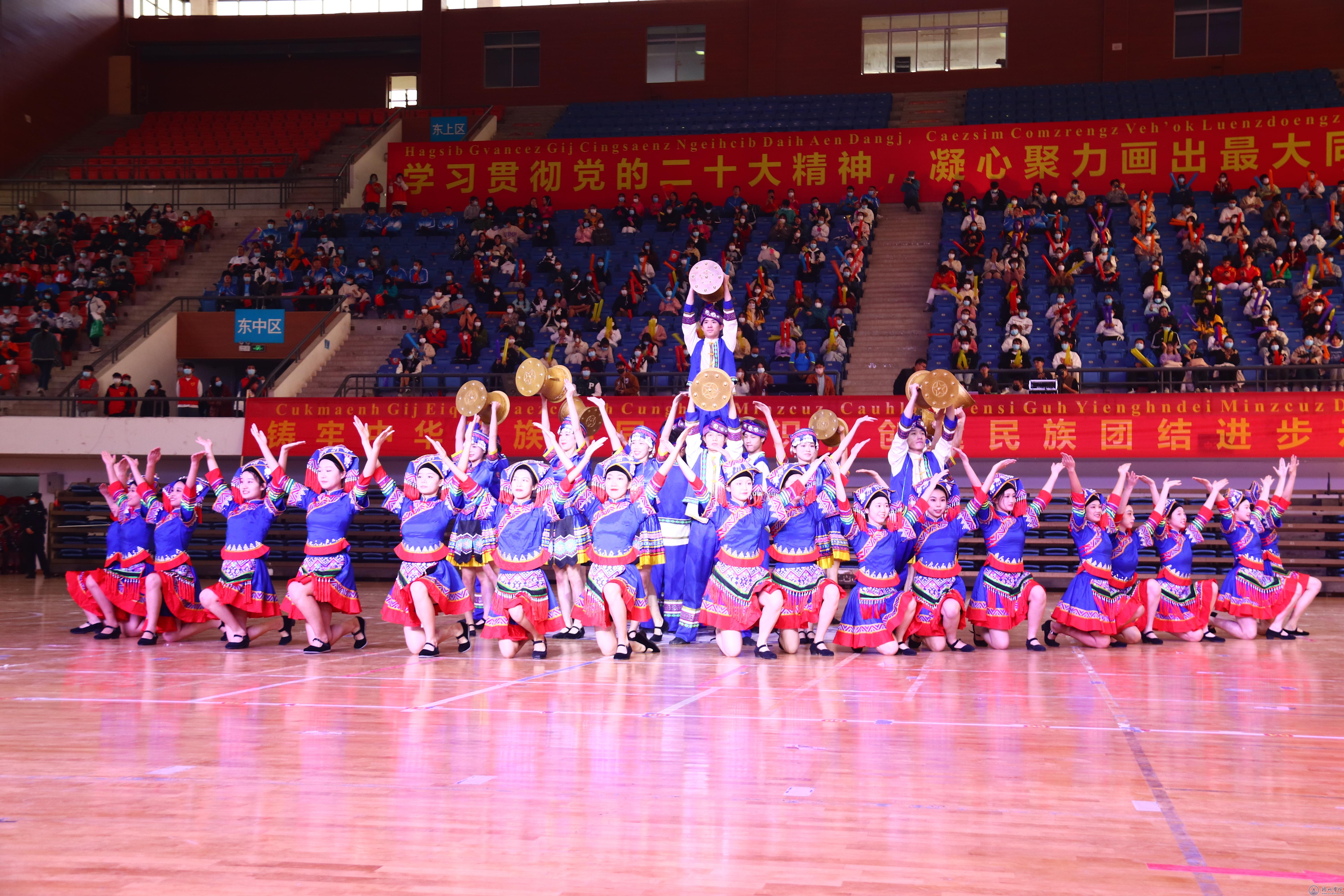 在开幕表演上,我校教师教育学院青年舞团带来舞蹈《红旗颂》、《花腰花》和《广西尼的呀》,旋转、摇摆、跳跃、舞旗,舞蹈表演者身着民族服饰,伴随着音乐起舞,舞姿动人,热情奔放。青年舞团带来的表演充分彰显了民族团结面貌,展示了壮乡人民在党的精神的引领下奋力建设壮美广西的精神面貌。
