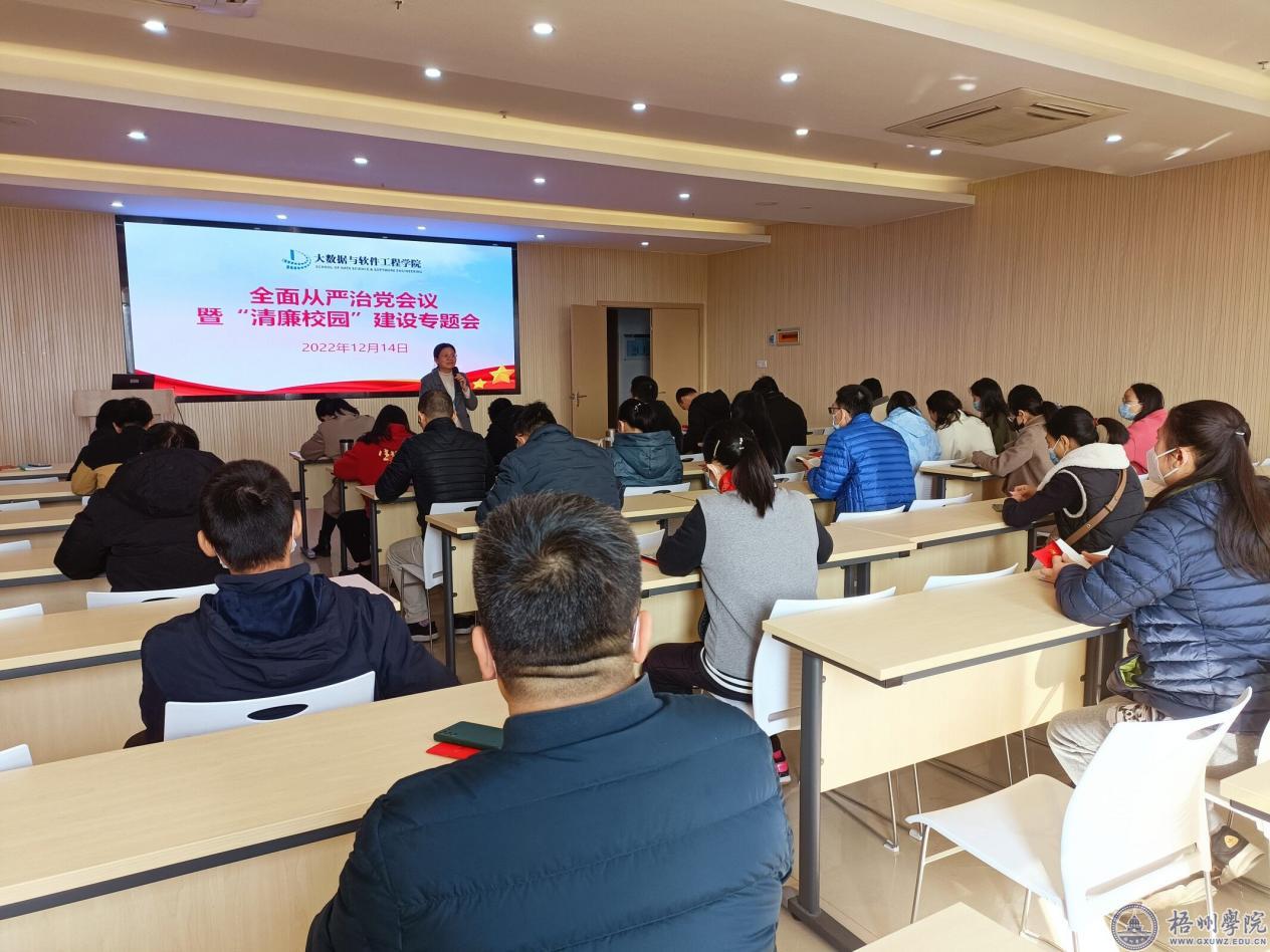 为进一步学习贯彻党的二十大精神,持续推进全面从严治党和“清廉校园”建设,12月14日下午,大数据与软件工程学院党委召开全面从严治党暨“清廉校园”建设专题会,会议由学院党委书记吴燕端主持,全体教师党员参加。