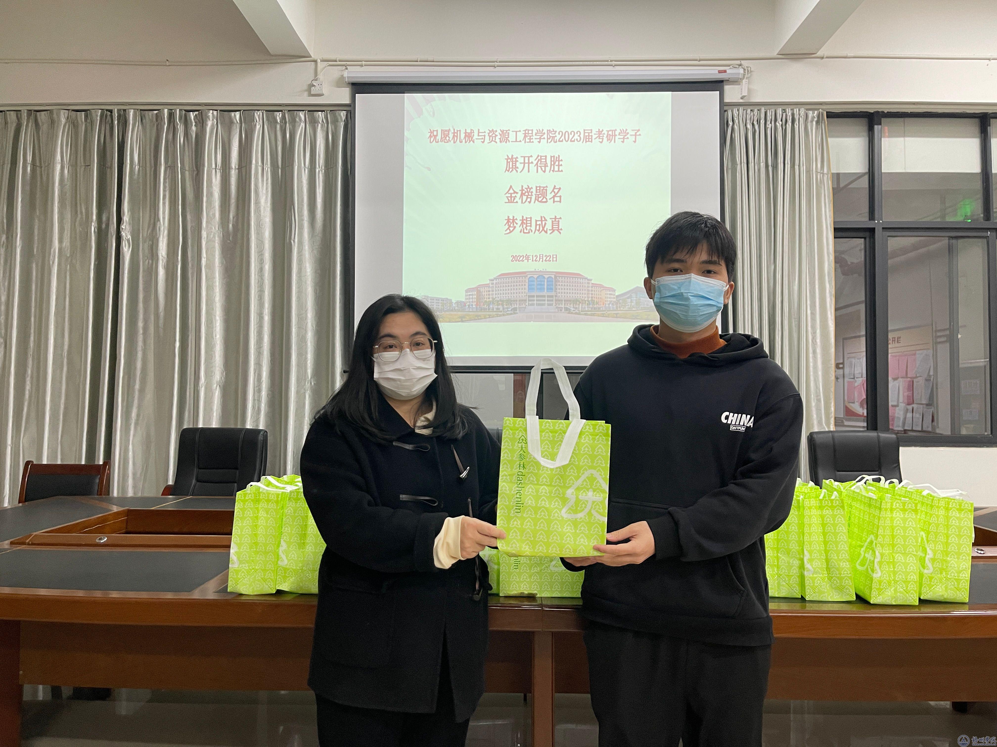 12月22日下午,机械与资源工程学院在科技楼1314室为本院50余名考研学生送上载满祝福的大礼包,里装有口罩、酒精湿巾等防疫物品,为考研学生加油打气。老师们在发放的时候亲切询问大家的备考情况和日常生活情况,为每一位奋力追梦的学子加油,并提醒同学们做好疫情防护,积极调适心态,以最好的状态迎考。