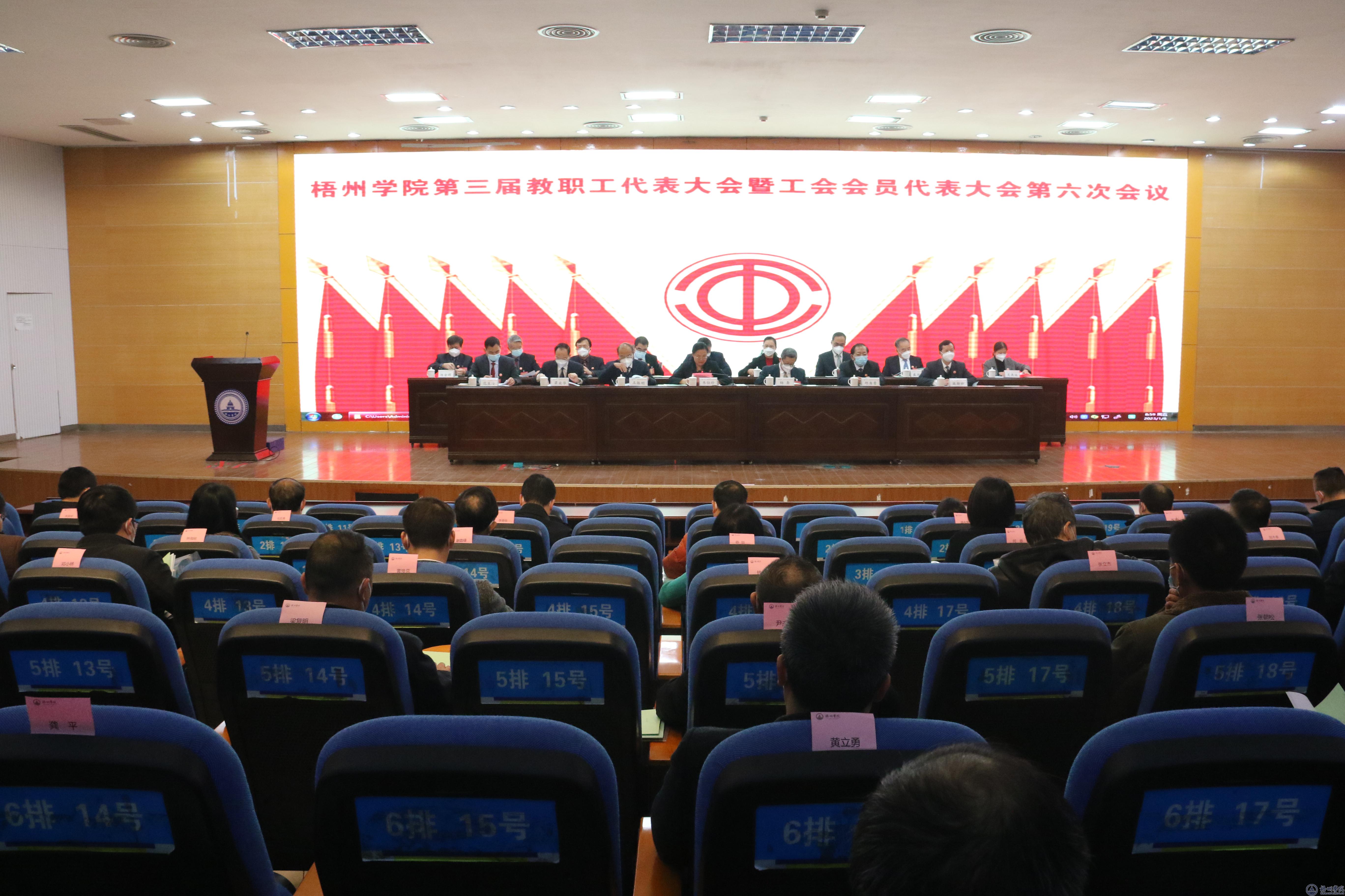 1月6日,学校在明理楼一楼报告厅召开第三届教职工代表大会暨工会会员代表大会第六次会议,学校领导韦仕珍、杨奔、玉振明、邱房贵、梁业华、麻新纯、宾月景、范生汝出席会议,142名正式代表,3名列席代表参加会议。