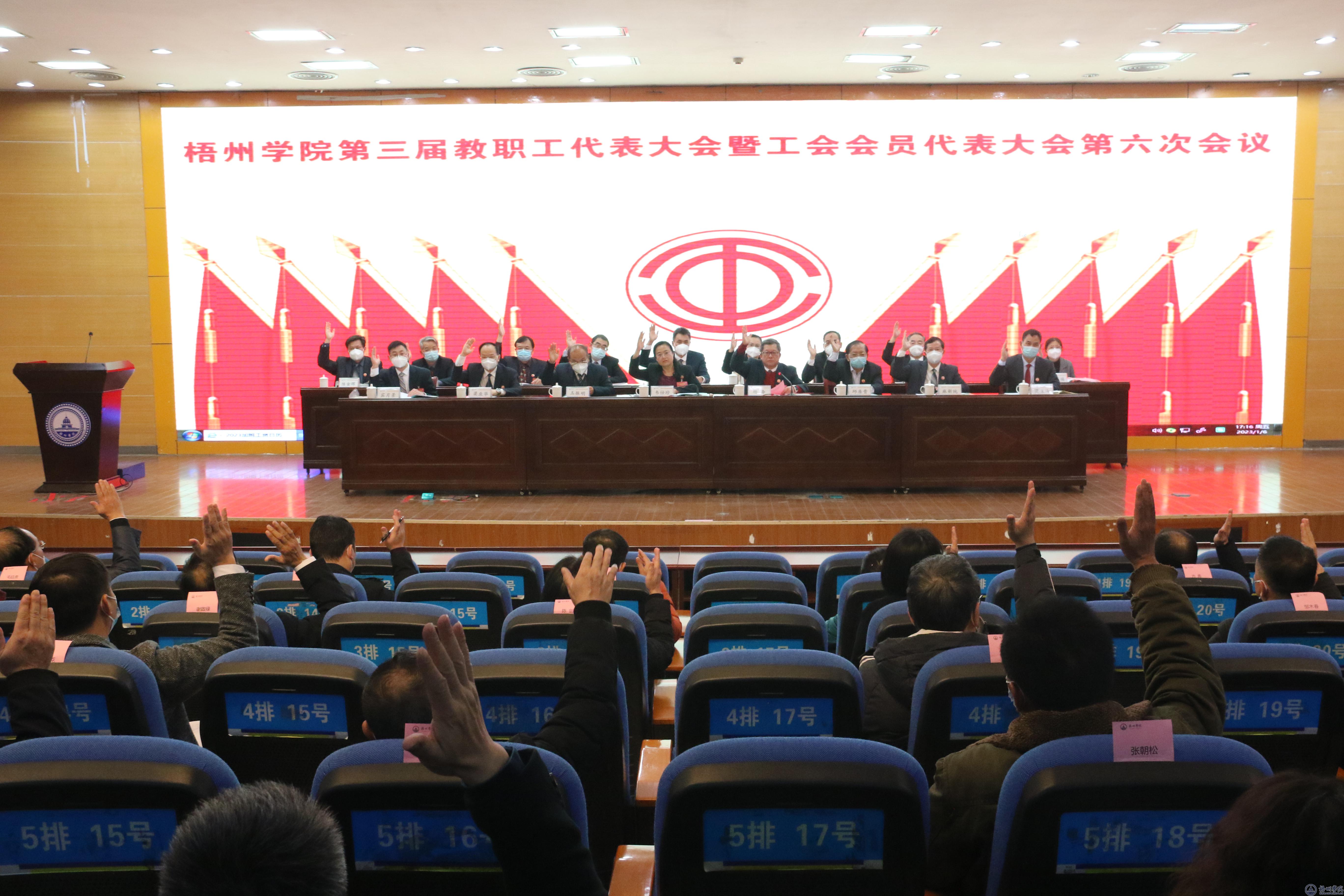 下午5时,学校在明理楼一楼报告厅举行大会闭幕式。会议由杨奔校长主持。大会表决并通过了《梧州学院第三届教职工代表大会暨工会会员代表大会第六次会议工作报告》和《梧州学院岗位设置与聘用管理实施办法》。