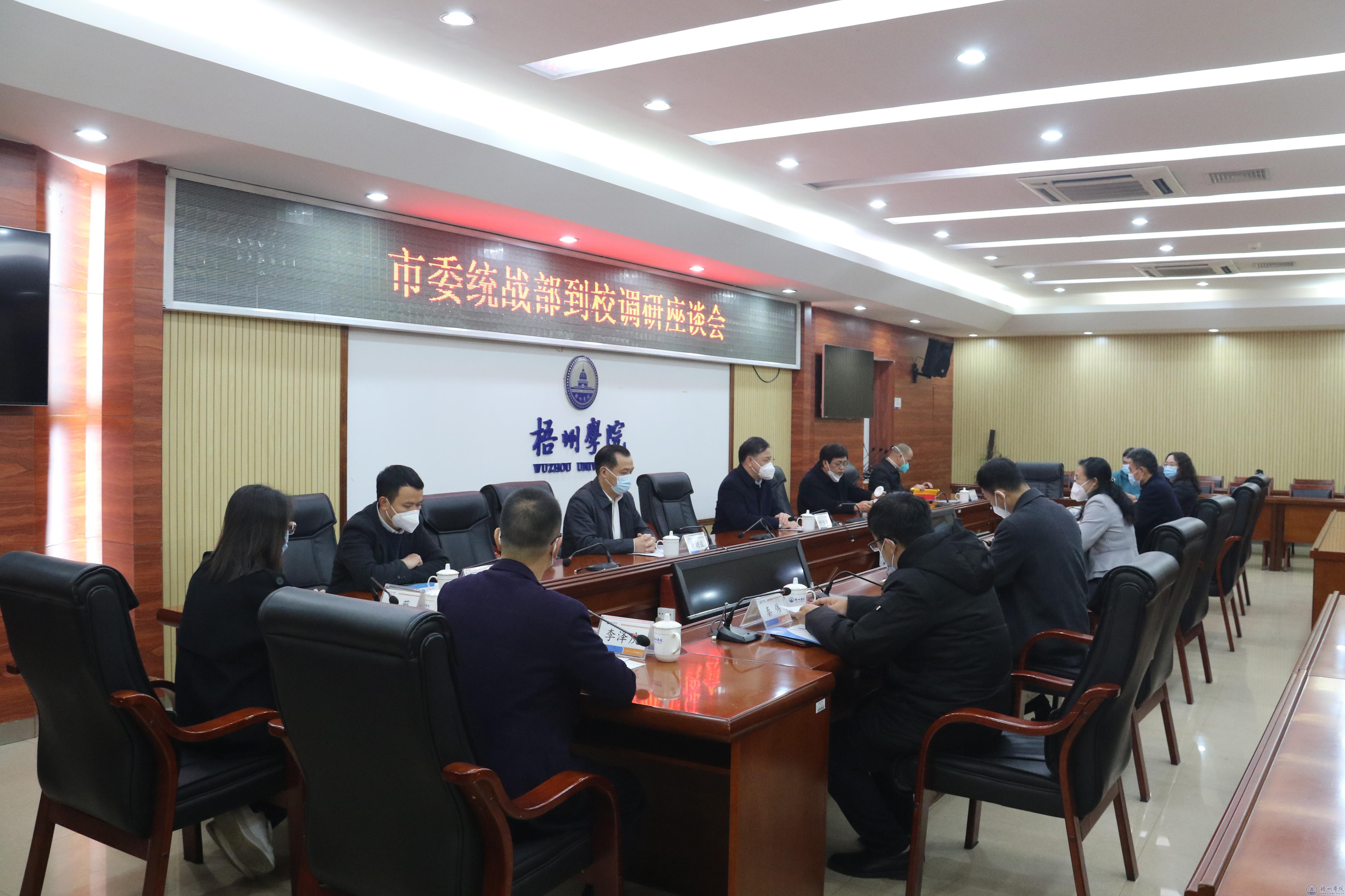1月5日下午,梧州市委常委、统战部部长何世恰一行5人到我校座谈,并代表市统一战线民族团结进步体育运动会组委会赠送“校地合作共襄盛举 同心圆梦携手未来”锦旗。我校党委书记韦仕珍,党委常委、副校长范生汝,以及梧州市委统战部、我校党委统战部和运动会工作组相关负责人代表参加座谈会。