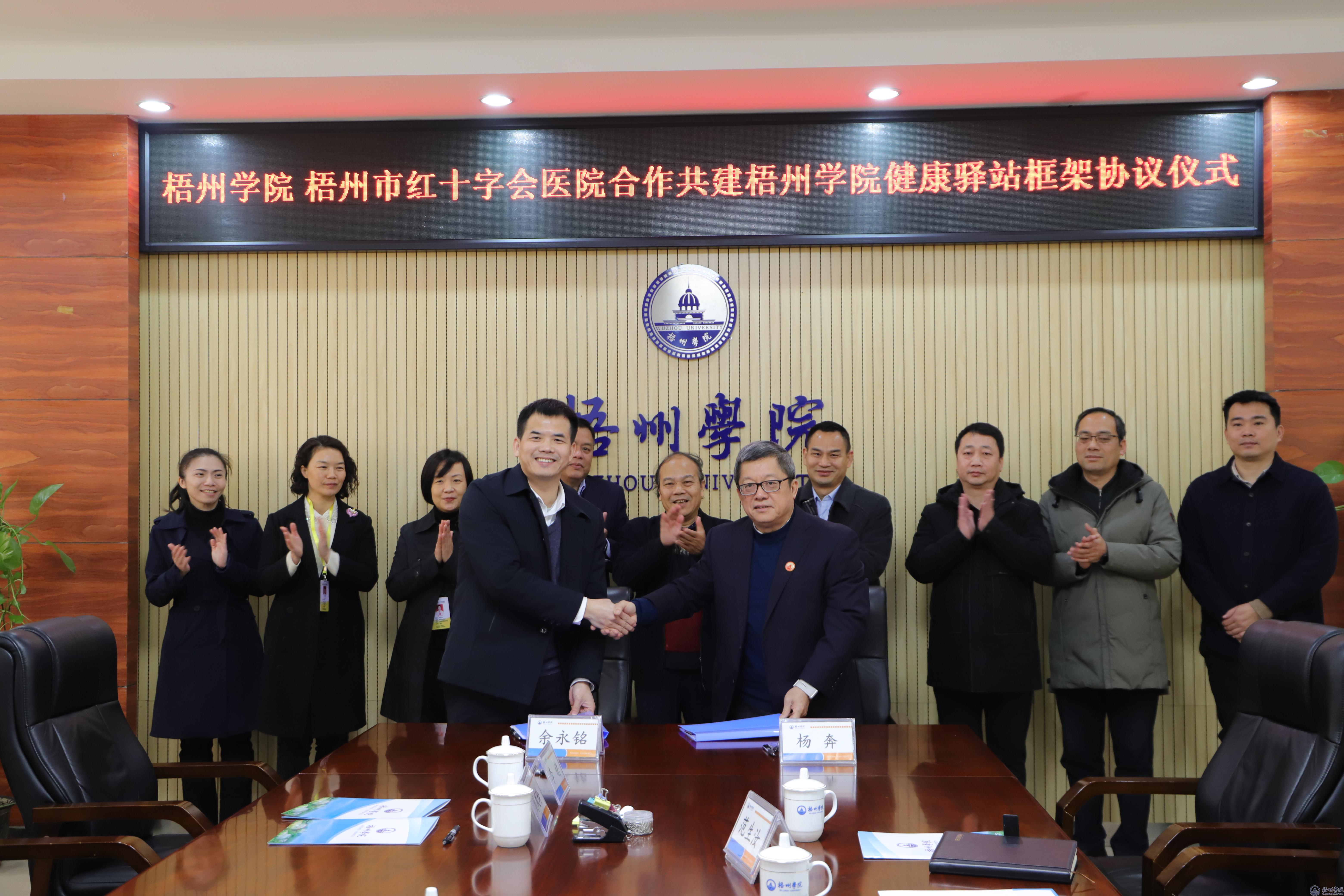 2月16日上午,我校与梧州红十字会医院共建健康驿站框架协议签约仪式在明理楼八楼第二会议室举行。梧州红十字会医院院长余永铭、党委专职副书记刘凤玲、副院长郑裕明、副院长李皓,我校校长杨奔、副校长玉振明、副校长范生汝出席签约仪式。签约仪式由我校副校长玉振明主持。