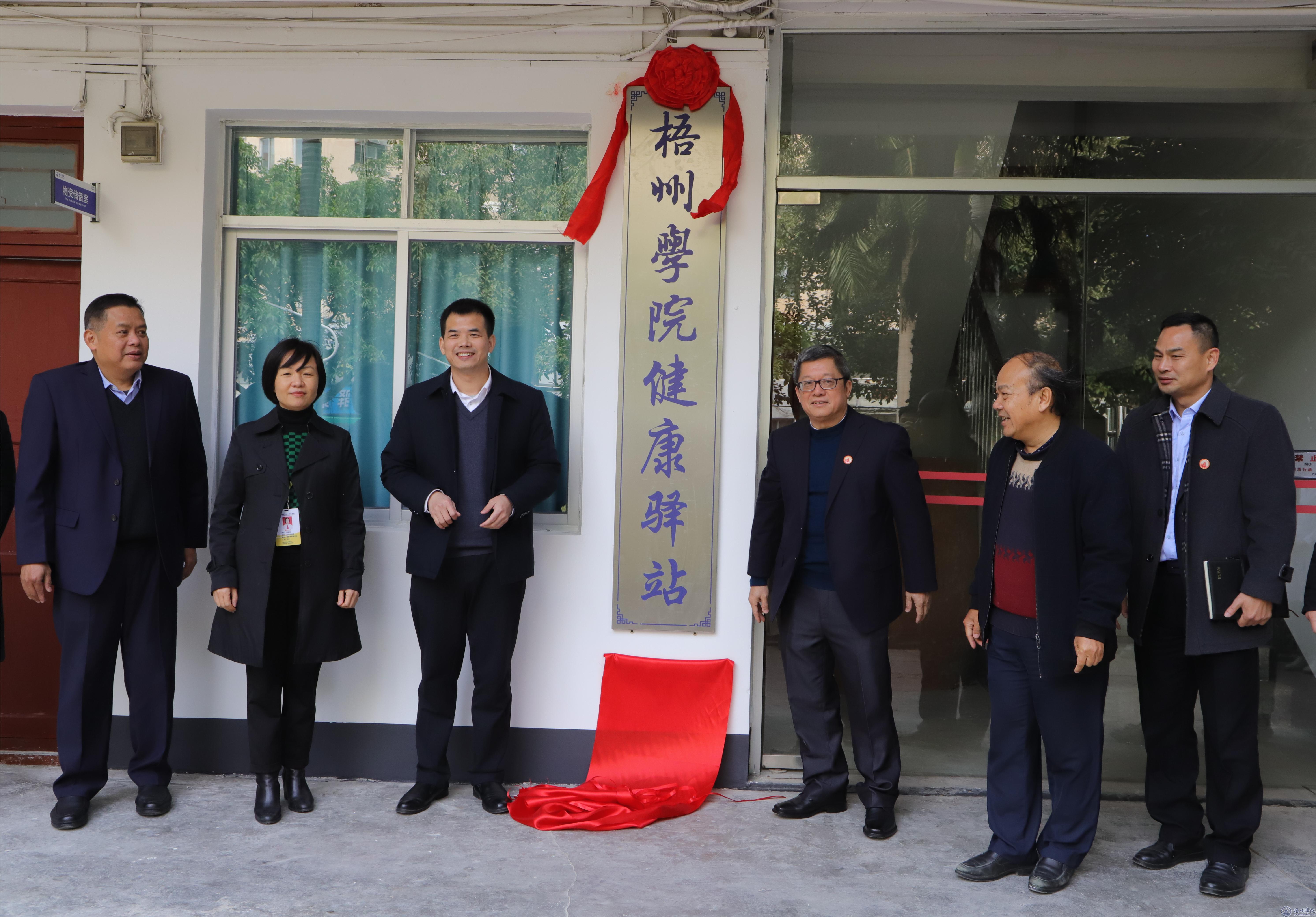 签约仪式结束后,校院双方前往A3学生宿舍楼实地参观了解梧州学院健康驿站的建设情况。我校校长杨奔、梧州红十字会医院院长余永铭共同为梧州学院健康驿站揭牌。