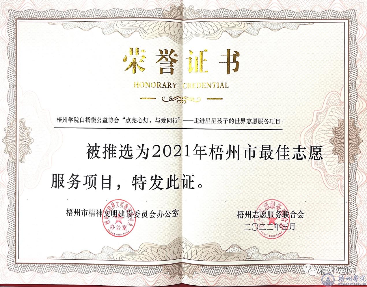 学院团委“白杨微公益”被评为梧州市2021年度学雷锋最佳志愿服务项目