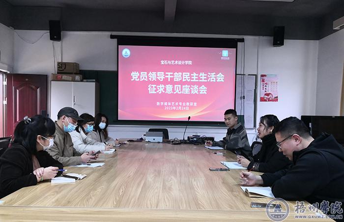 为提高质量开好2022年度民主生活会,宝石与艺术设计学院党委于2月24日至3月6日期间,深入各专业教研室召开领导干部民主生活会征求意见座谈会,座谈会上,各教研室的教师代表结合实际,围绕生活和工作当中遇到的困难和问题进行了深入的交流,对党、务融合,青年教师培养,课程思政等方面积极建言献策,提出建设性意见和建议。