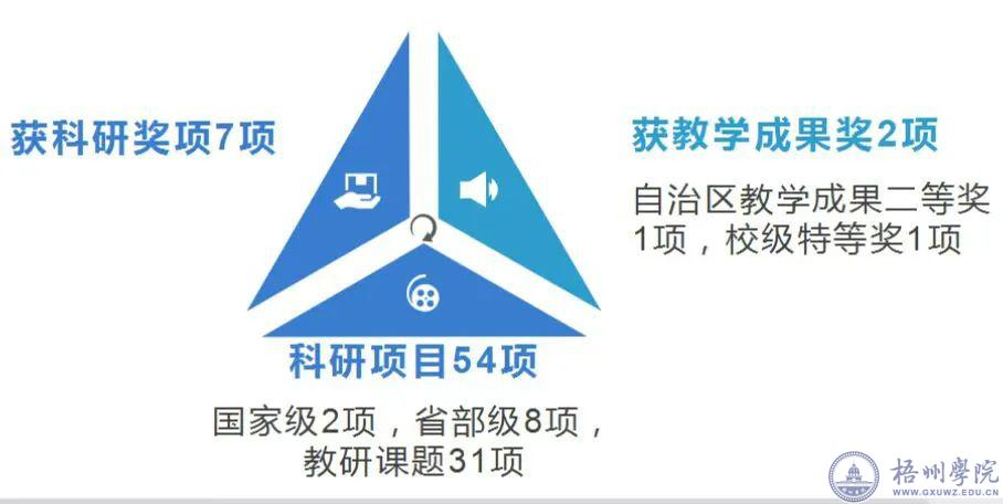 自学院成立以来,经过教职工们的不断努力,获科研奖项7项;获教学成果奖2项(其中:自治区教学成果二等奖1项,校级特等奖1项);获各级科研项目54项(其中:国家级2项,省部级8项,教研课题31项);科研经费达1017.86万元;发表学术论文120多篇(其中:SCI、EI论文20篇,中文核心45篇);获专利授权共48项(其中:发明专利14项,实用新型34项);学术专著2部,教材3部。