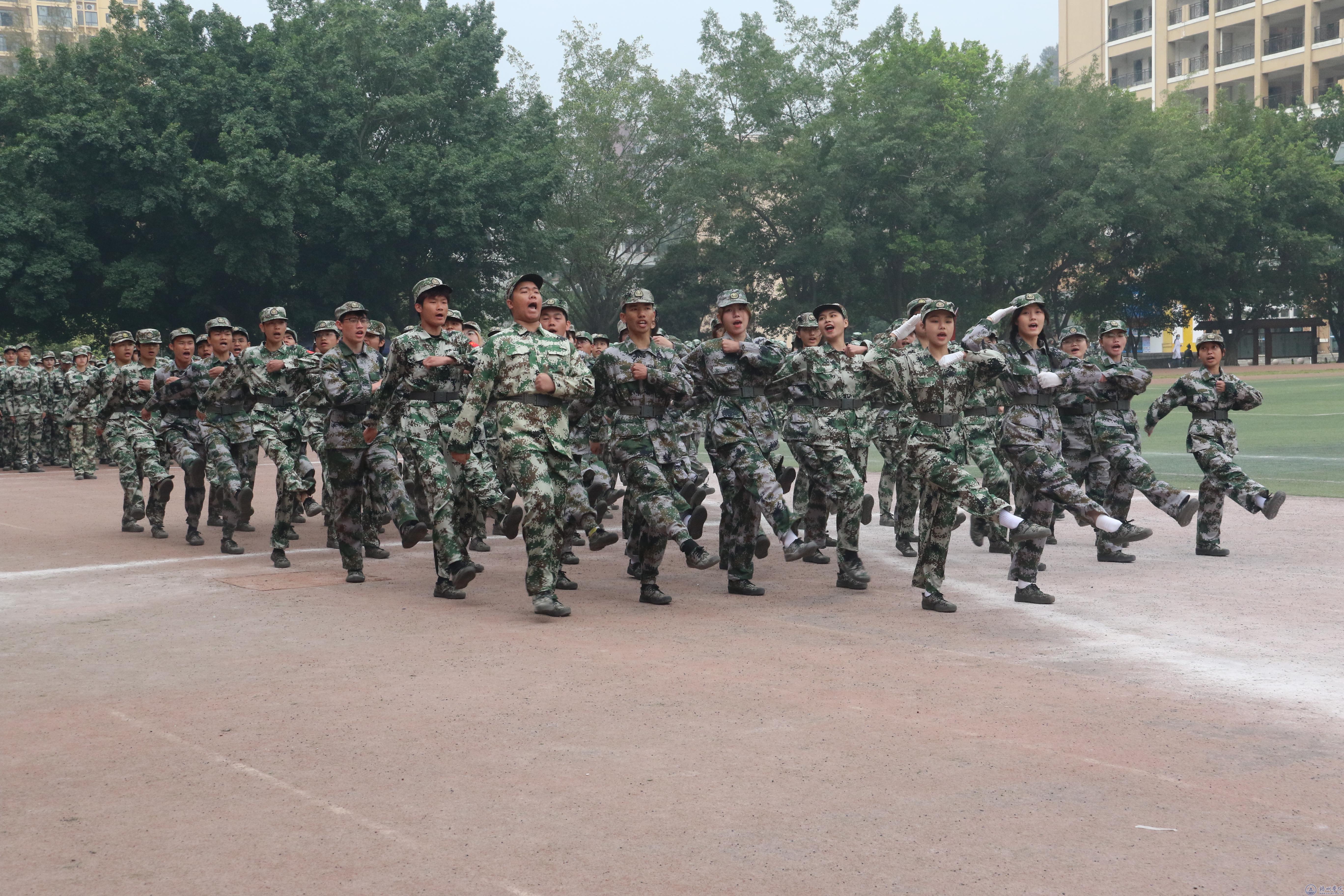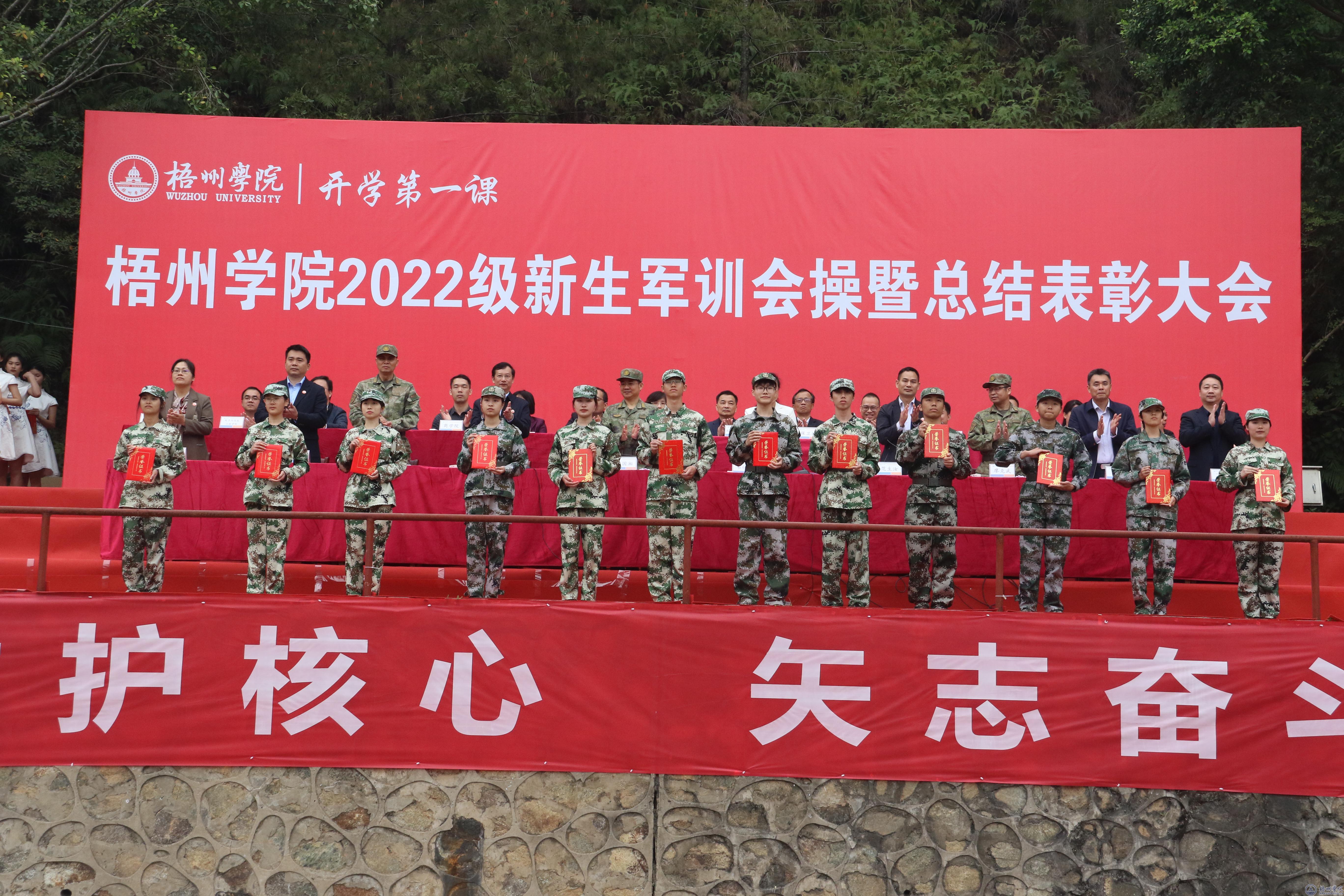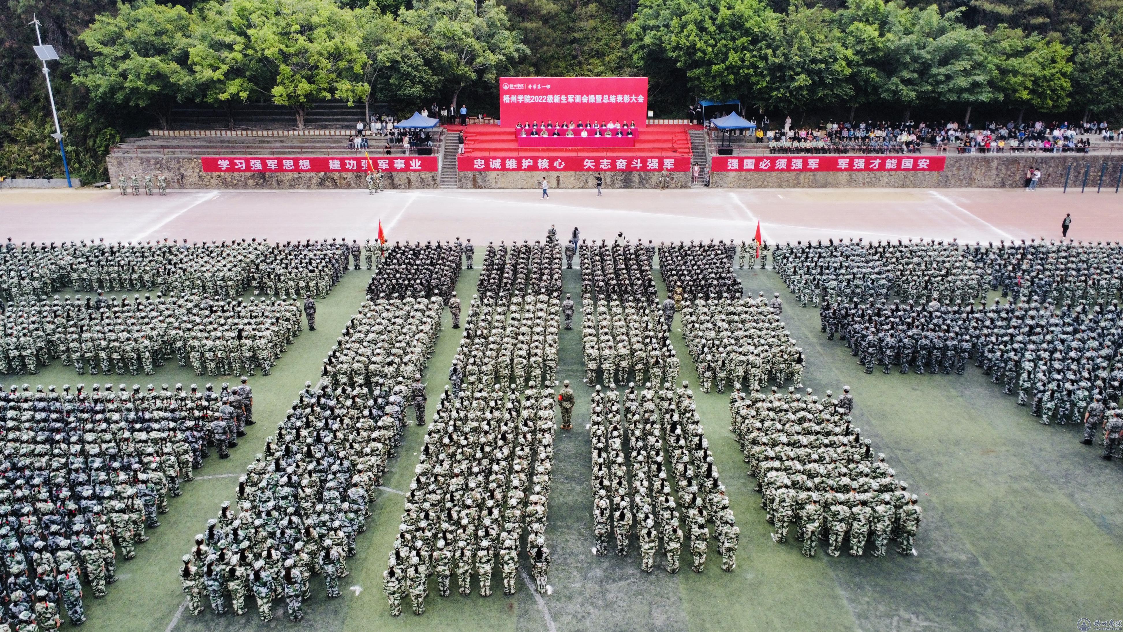 在新生军训会操中,梧州军分区领导和学校领导检阅新生军训团。4个营55个连,身着统一军绿色迷彩服,步伐稳健、口号激昂、整齐划一,依次通过主席台接受检阅。