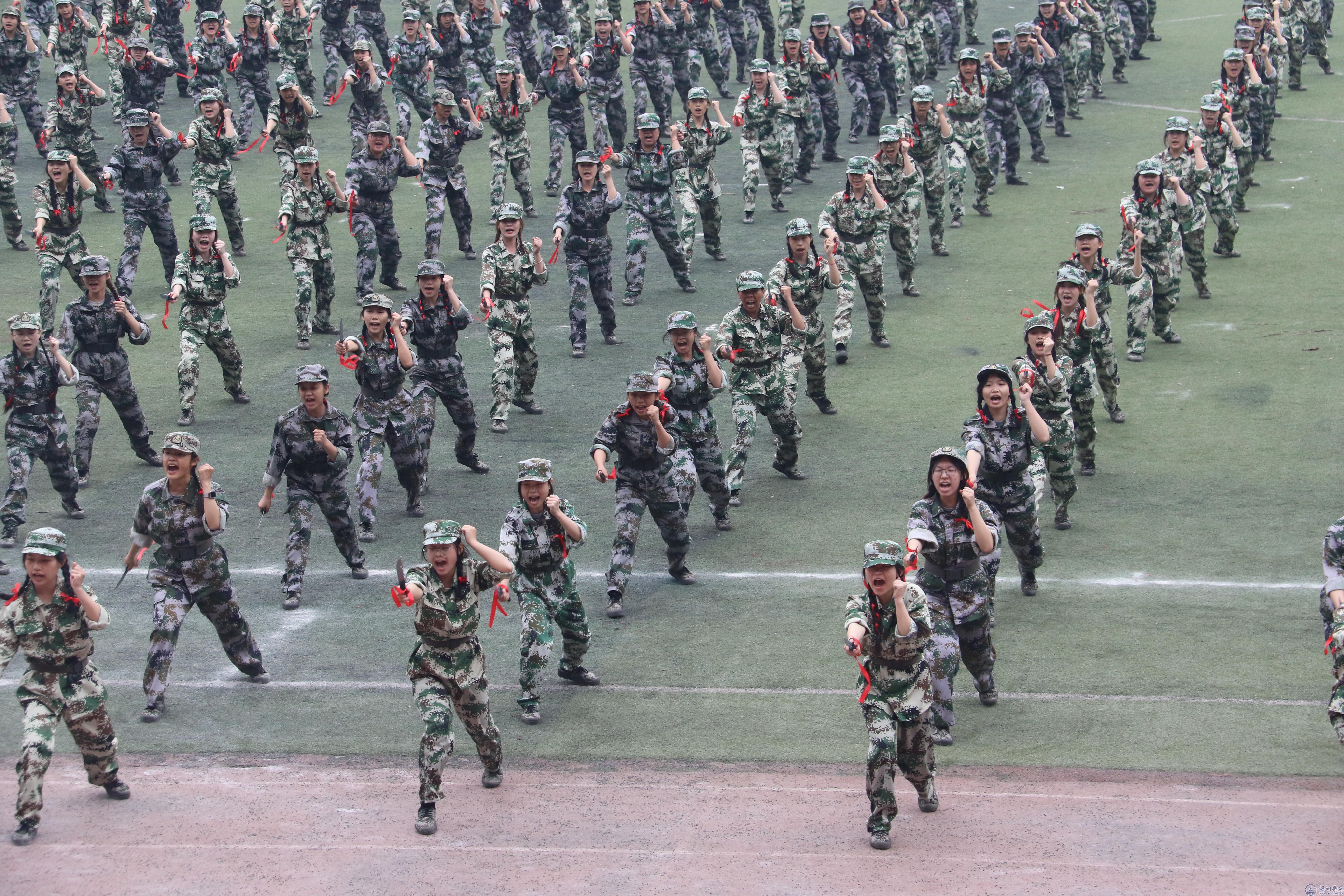军训汇报中,新生军训团分别展示了刺杀操、捕俘拳、匕首操以及特种战队的科目训练成果。田径场上杀声阵阵,出拳、下劈、匍匐一招一式干脆利落,体现出新生不畏困难,刻苦训练、誓要保家卫国的坚定信念。其中由114名男女生组成的战术反恐方队通过模拟真实反恐场景,生动展现了我国军人不怕牺牲、英勇战斗的精神,将现场的气氛推向高潮。