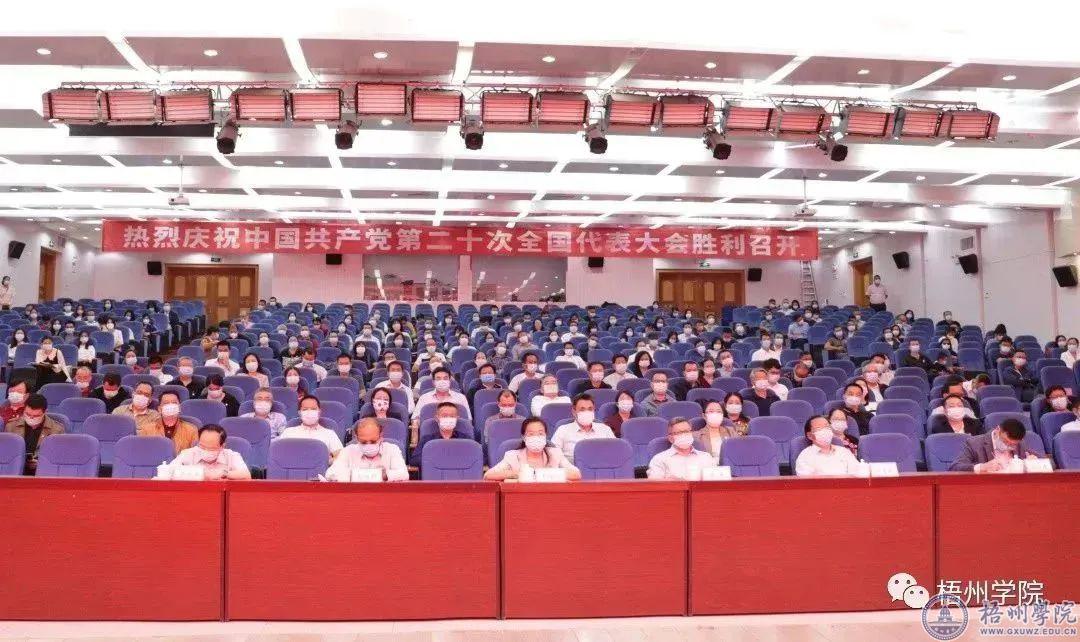 学校领导带头宣讲党的二十大精神,全校掀起学习党的二十大精神热潮。学校官网开辟“聚焦二十大”、“学习二十大”专栏,专题报道我校师生对党的二十大报告的感想体悟、各单位各部门学习宣传贯彻党的二十大精神的情况。梧州电视台等媒体报道了我校师生收听收看党的二十大开幕盛况,采访报道了我校专家学者对党的二十大报告的解读等。