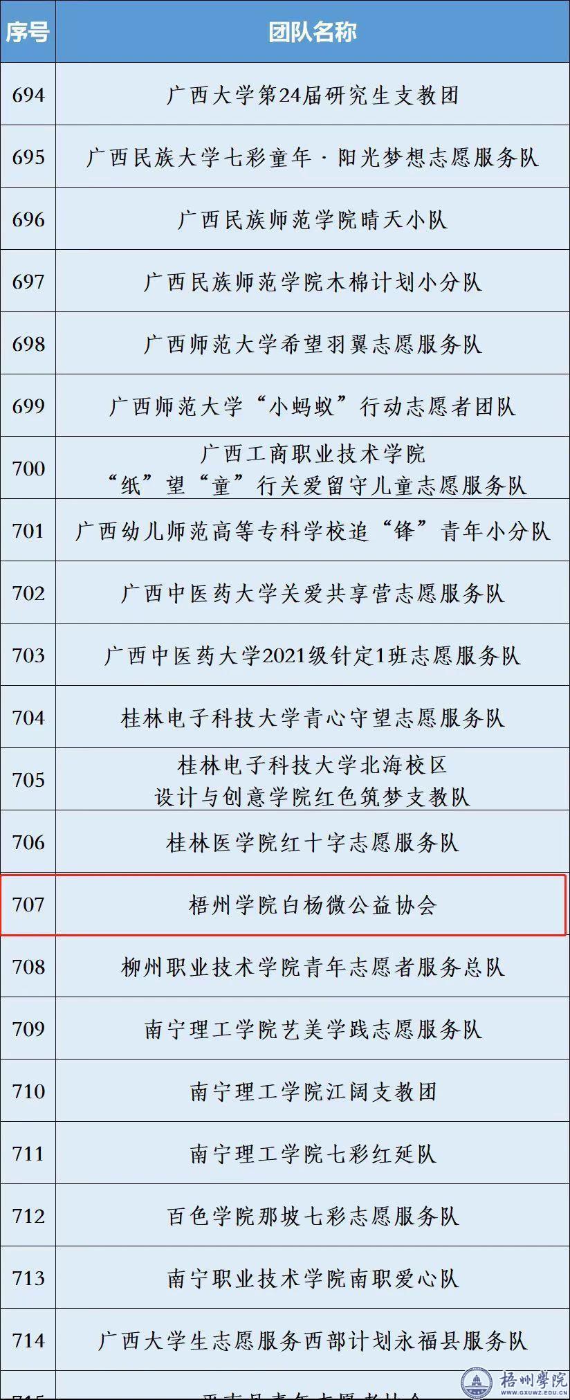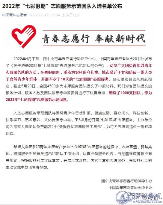 6月6日,团中央青年志愿者行动指导中心、中国青年志愿者协会秘书处发布2022年“七彩假期”1000支志愿服务示范团队名单,梧州学院法学院报送的白杨微公益协会志愿服务队从4500多支队伍中成功入选。法学院白杨微公益协会志愿服务团队多年来开展以支教和健康教育为主要内容的志愿服务,曾被西江都市报等媒体报道,荣获2018年“广西五四红旗团支部(总支)”称号,被推选为2021年度梧州市学雷锋最佳服务项目。(官网 2022-06-09发布)