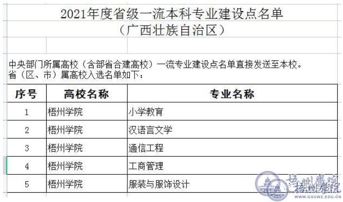 根据教育部办公厅印发了《关于公布2021年度国家级和省级一流本科专业建设点名单的通知》(教高厅函〔2022〕14号),我校小学教育、汉语言文学、通信工程、工商管理和服装与服饰设计5个专业被确定为2021年度省级一流本科专业建设点。(官网 2022-06-16 发布)