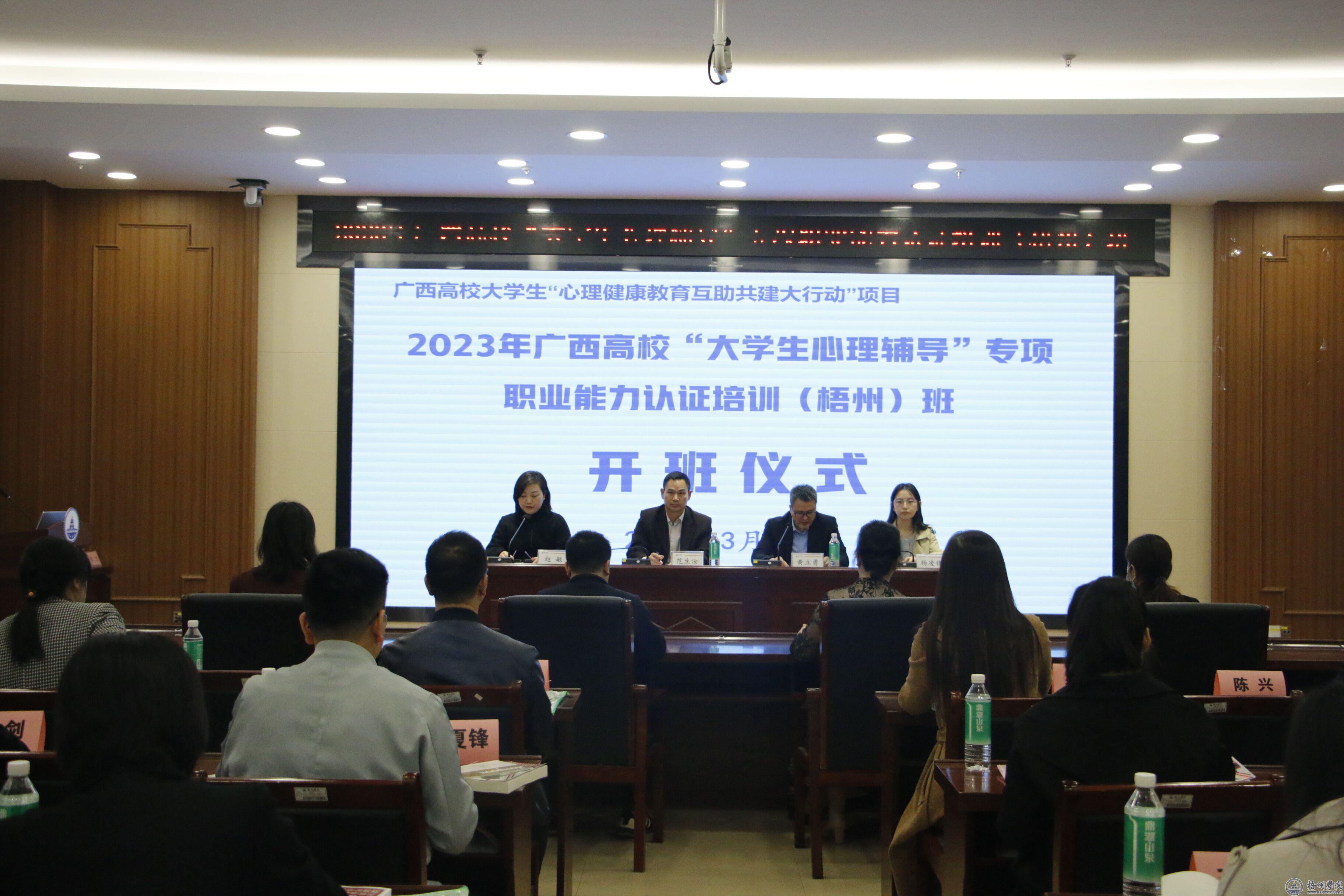 3月16日—20日,由我校牵头,联合贺州学院、梧州职业学院、梧州医学高等专科学校等四所互助共建组群高校在科技楼举办了2023年广西高校“大学生心理辅导”专项职业能力认证培训(梧州)班,30多名心理健康专兼职教师、辅导员参加培训。学校党委常委、副校长范生汝,广西大学生就业服务中心主任助理、市场部部长赵敏出席开班仪式。
