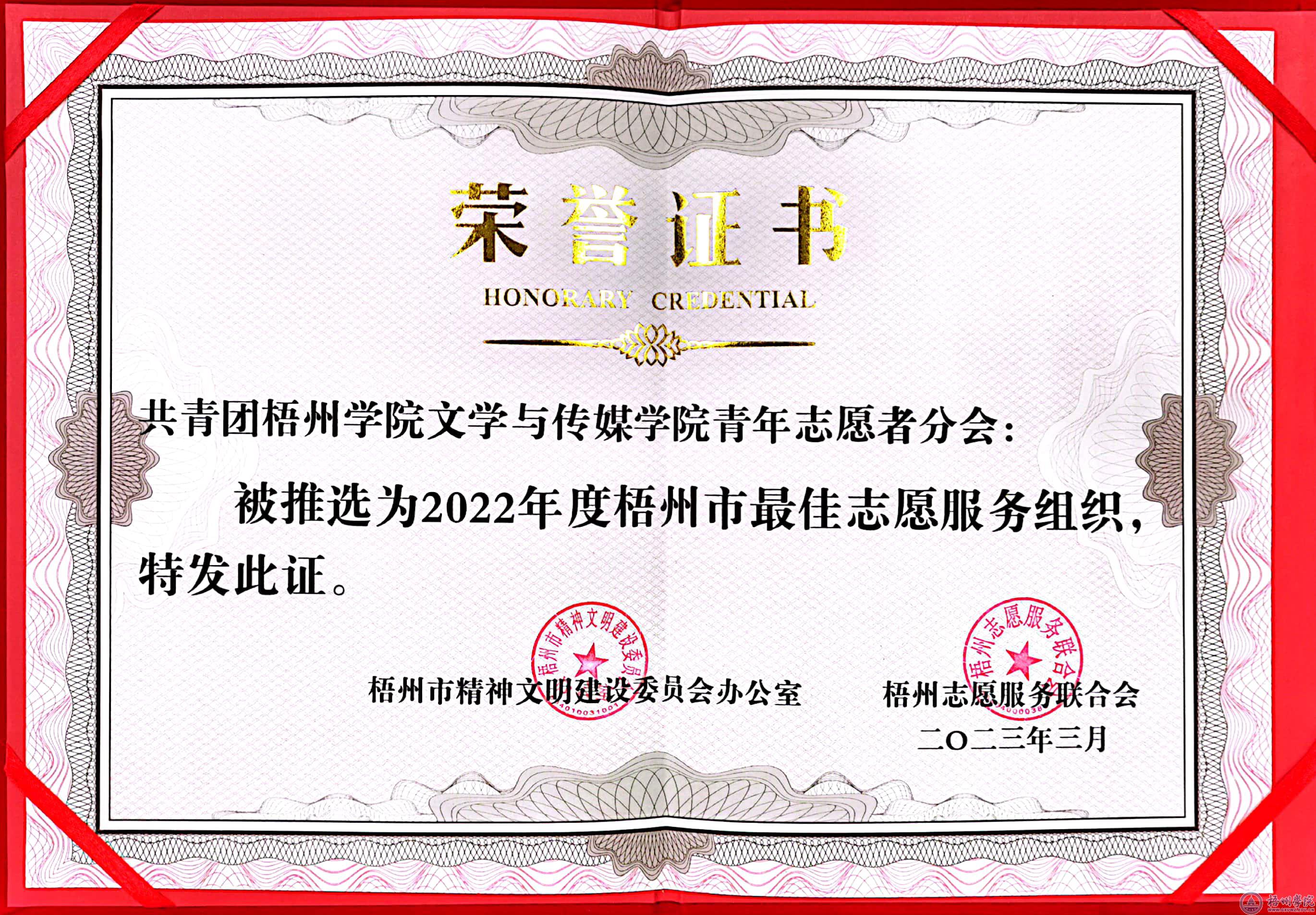近日,根据《梧州市文明办 梧州志愿服务联合会关于表扬2022年度梧州市学雷锋志愿服务先进典型的通报》(梧文明办〔2023〕5号),我校文学与传媒学院青年志愿者分会获评年度最佳志愿服务组织。