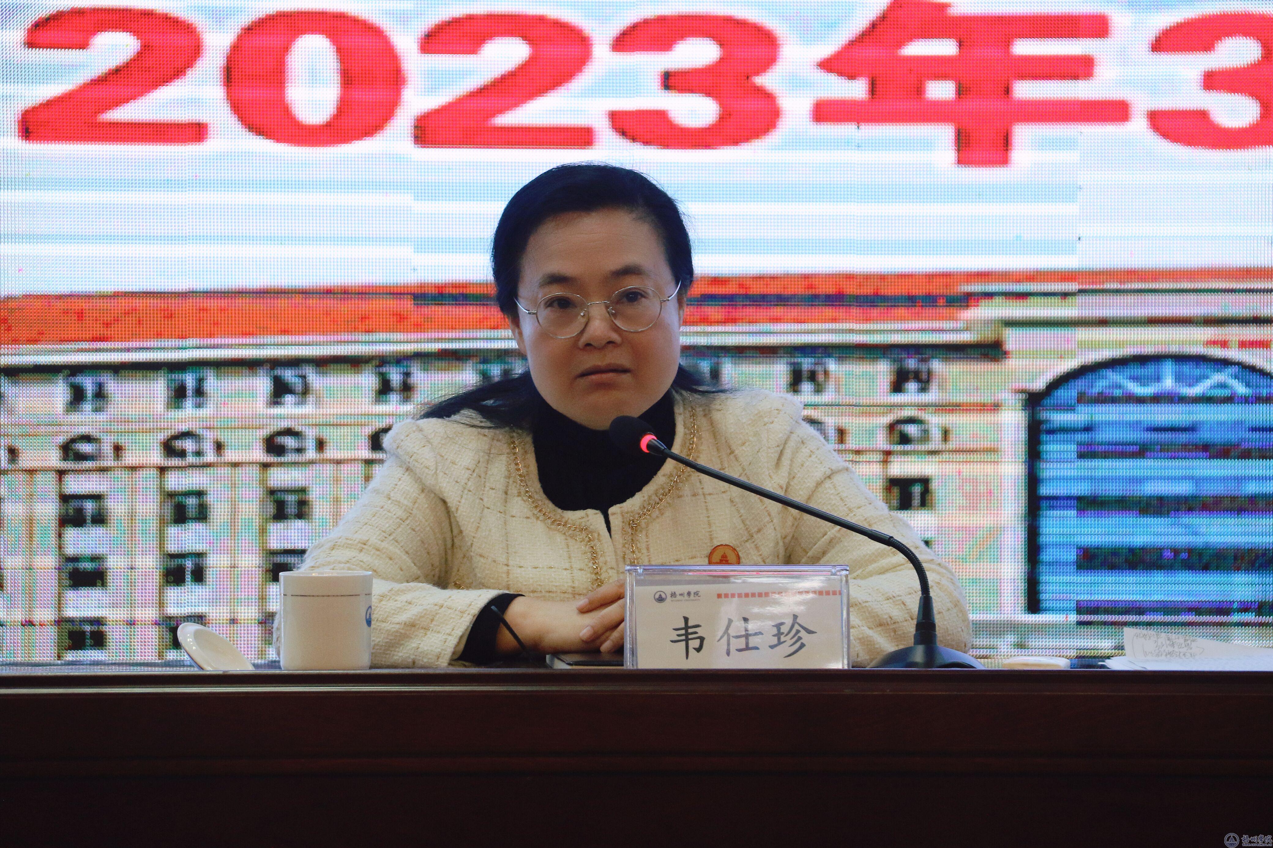 韦仕珍书记在会上作讲话,她指出就业是最大的民生,一头连着学生的未来,一头连着学校的发展大局。全校上下要高度重视毕业生就业工作,提前谋划,科学规划,不断总结凝练毕业生就业创业工作经验和做法;用心、用力、用情做好毕业生就业工作,通过访企拓岗等方式,进一步挖掘岗位资源,不断拓宽就业渠道;做实做细毕业生就业服务,加强毕业生就业帮扶,统筹做好毕业、招聘、考录等方面的指导工作,设立“校友论坛”,发扬榜样的影响力和引领力,帮助毕业生迈好走向社会的第一步。