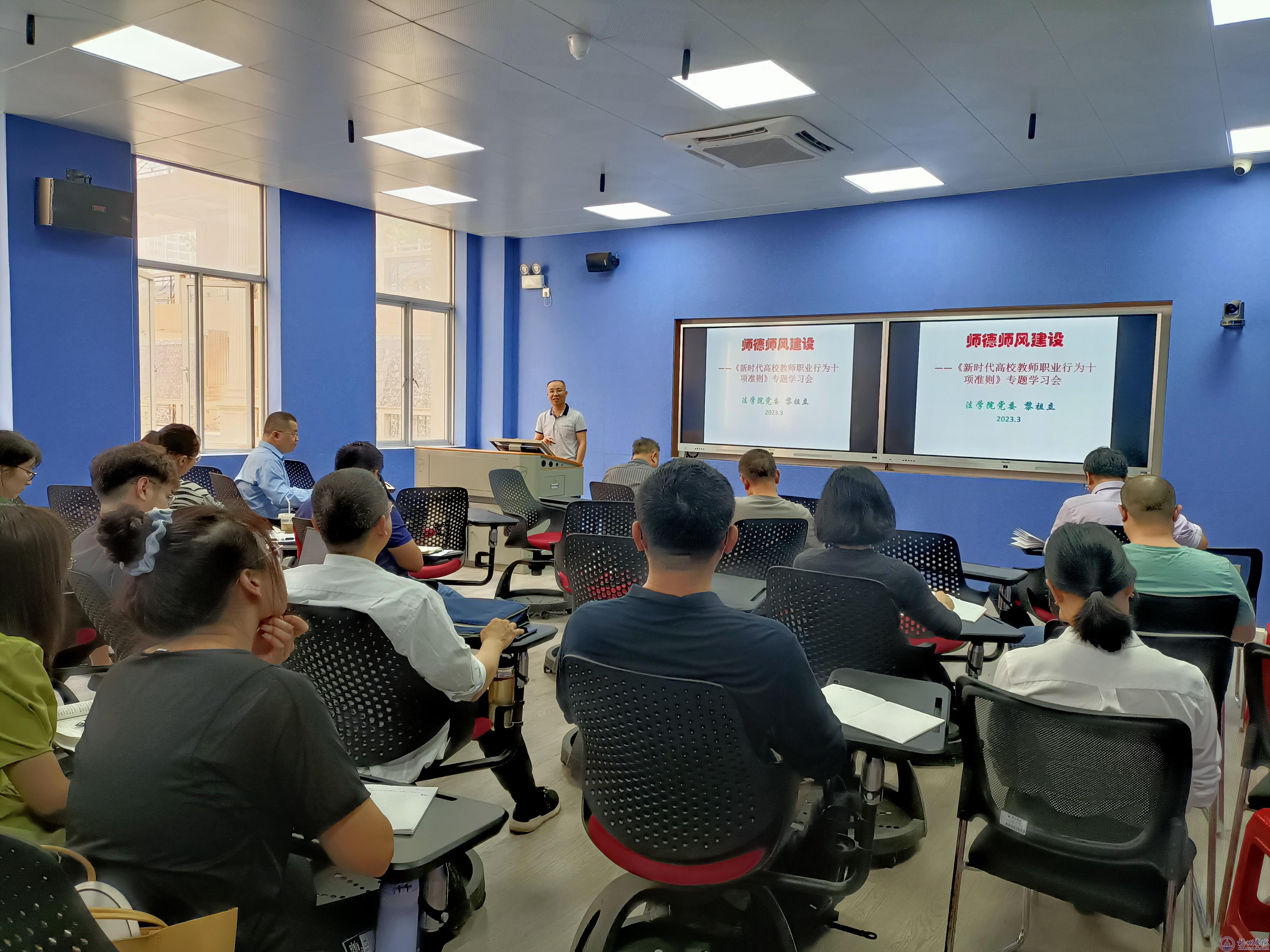 为进一步落实《关于加强和改进新时代师德师风建设的意见》精神,促进清廉学校建设,法学院于3月22日组织全体教师开展“师德师风建设”专题学习,学院党委书记黎祖立主持会议。