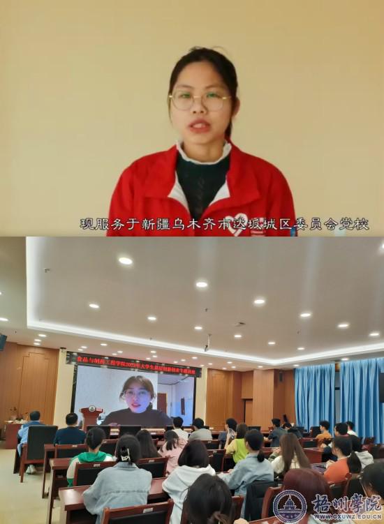 何明城详细介绍了大学生参加西部计划的流程和相关的政策知识;马小金和钟慧欣通过远程视频的形式介绍了在新疆的工作、生活以及个人的收获及工作所面临的困难和问题,鼓励同学们用一到三年的时间,到基层去,到祖国需要的地方去,展现青春的价值。