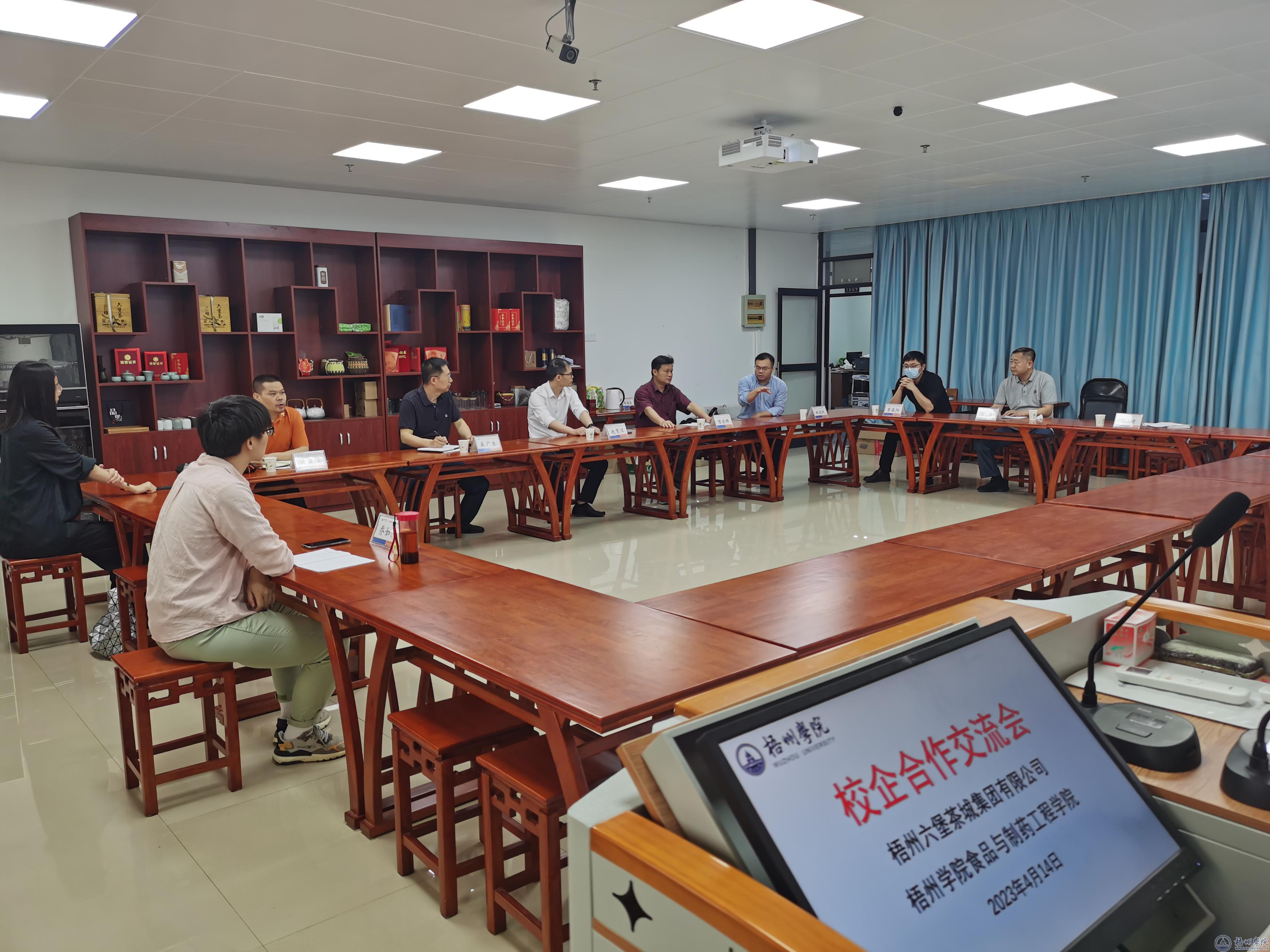 4月14日上午,食品与制药工程学院与梧州六堡茶城集团有限公司在科技楼1512茶艺室举行校企合作交流会。梧州六堡茶城集团有限公司总经理冼育汉一行5人和学院领导班子成员出席交流会。会议由陈金辉书记主持。