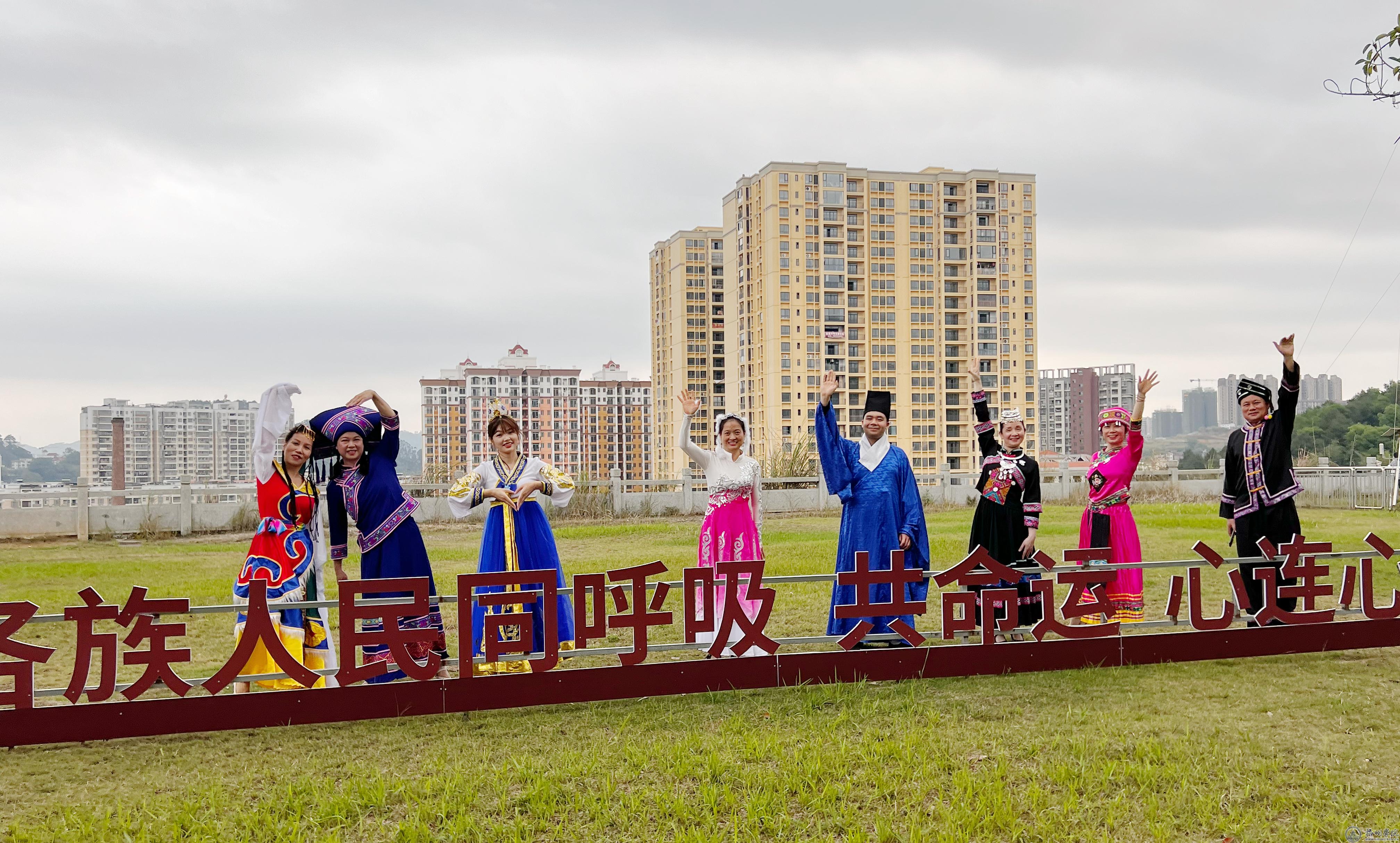 在梧州市六堡茶开茶节之际,学校组织各民族教职工代表及教职工合唱团在校园、六堡镇开展民族团结进步宣传活动。在鱼鳞坝、芊河茶厂、茶船古道起点合口码头、茶园,在东门广场、图书馆铸共广场、校友广场、北区宿舍广场,教工代表们身着艳丽的壮族、瑶族、傣族、藏族等民族服饰,伴着动听的民族音乐翩翩起舞,引得师生群众纷纷驻足观看。