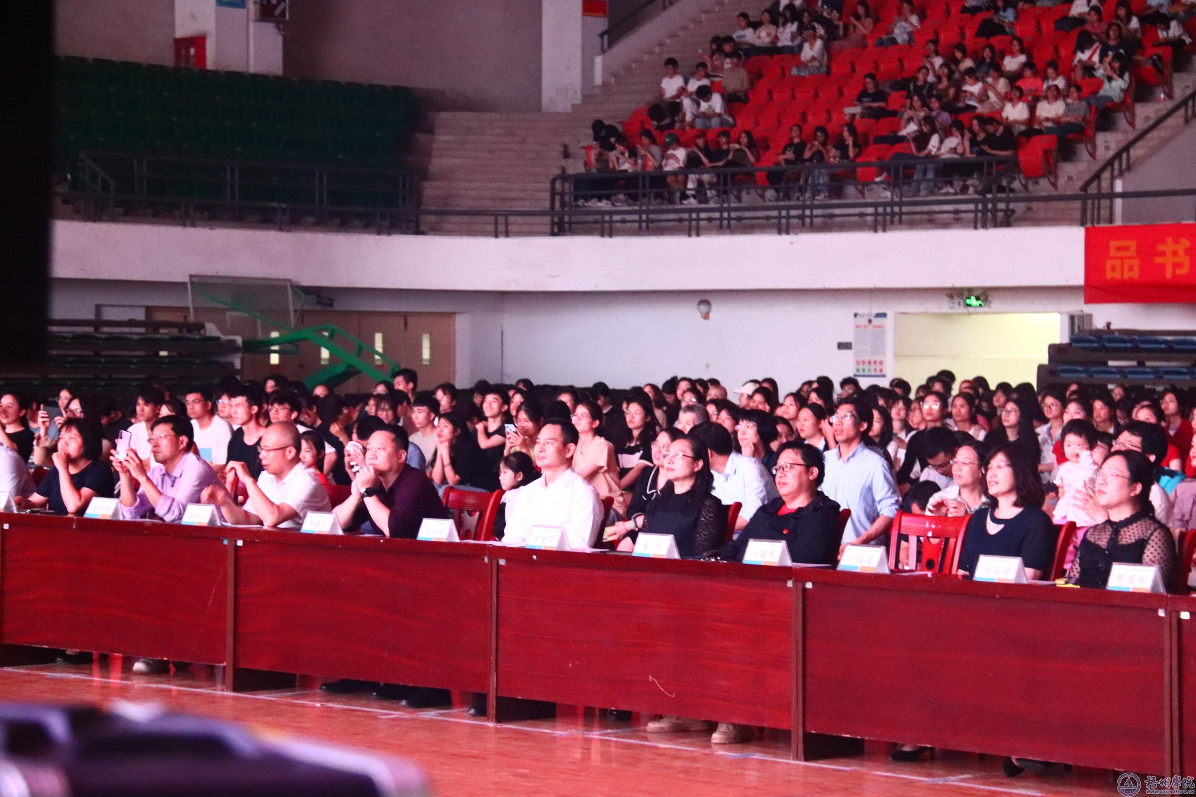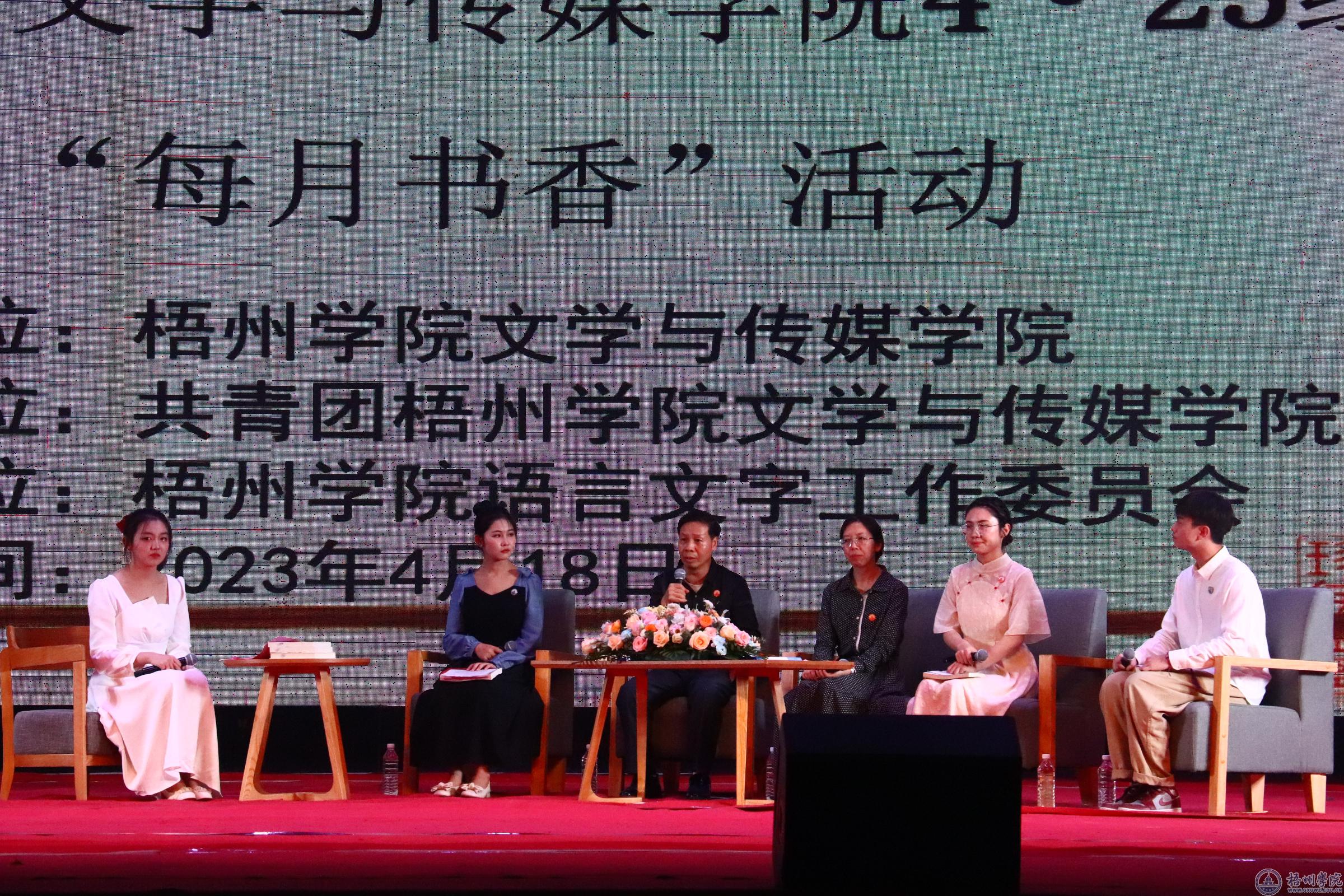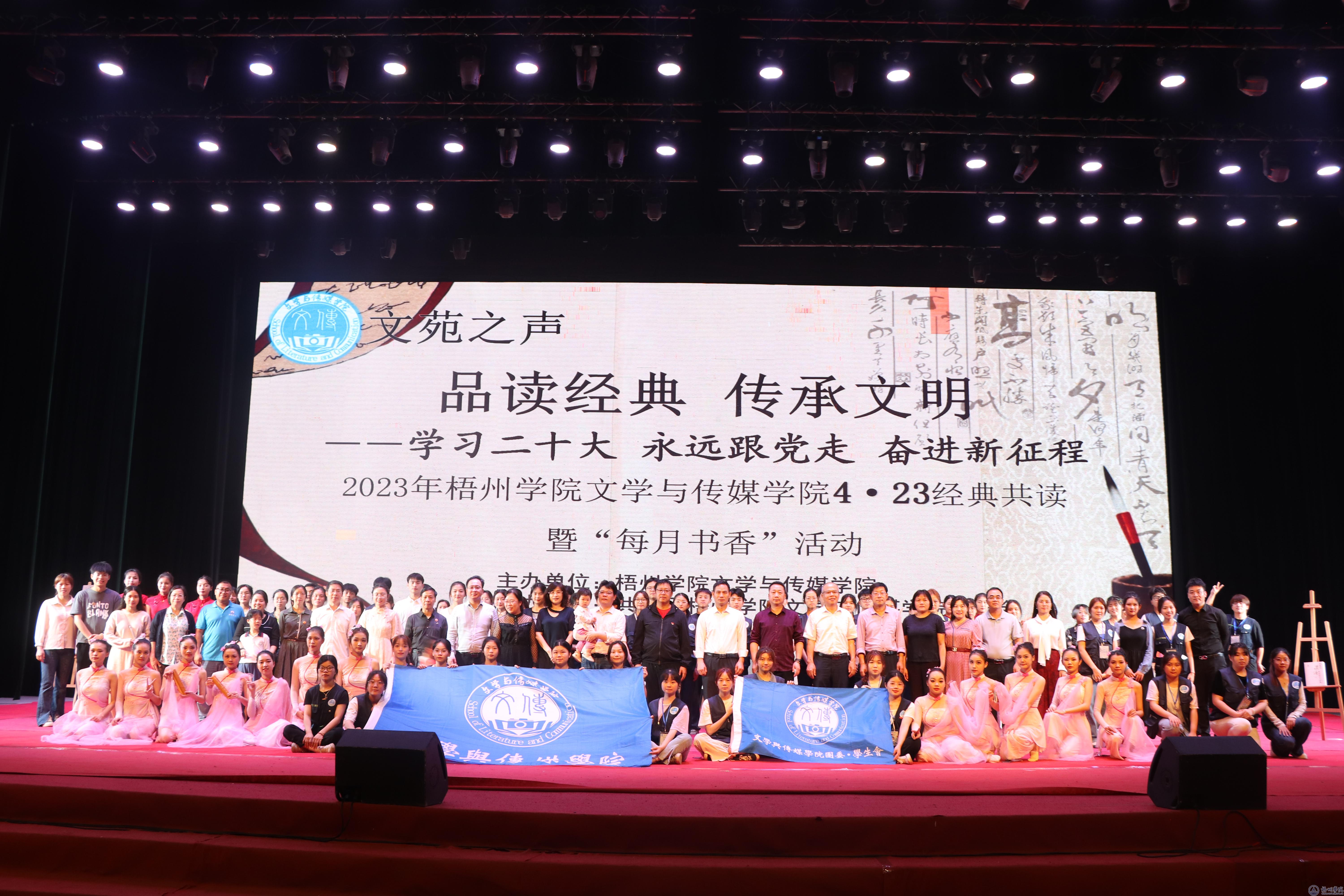 为深入学习贯彻习近平新时代中国特色社会主义思想和党的二十大精神,培养担当民族大任的时代新人,4月18日晚,文苑之声“品读经典,传承文明——学习二十大,永远跟党走,奋进新征程”4·23经典共读暨“每月书香”活动在我校体育馆三楼举行。梧州学院党委常委、副校长范生汝,党委宣传部、学生工作部(处)、教务处、团委、文学与传媒学院、图书馆负责人,二级学院党委副书记及师生代表参加了此次活动。本次活动由文学与传媒学院主办。