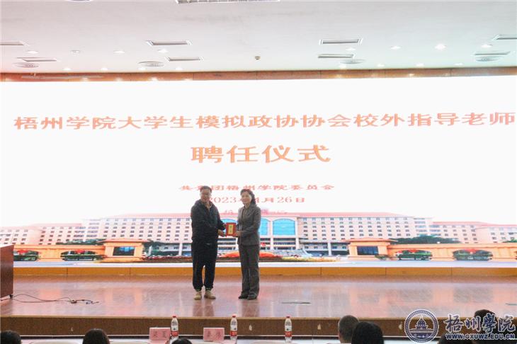 4月26日晚,梧州学院大学生模拟政协协会校外指导老师聘任仪式在明理楼一楼学术报告厅举行。梧州市政协提案法制委三级调研员梁夏、校团委书记秦伟、校团委相关老师、各二级学院团委书记(负责人)出席仪式,2023年团干部培训班、第六期“青马工程”训练营全体学员、梧州学院大学生模拟政协协会成员参加仪式。仪式由校学生会主席团成员、第六期“青马工程”训练营副班长王馨悦主持。