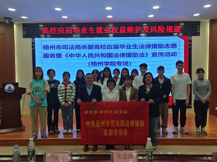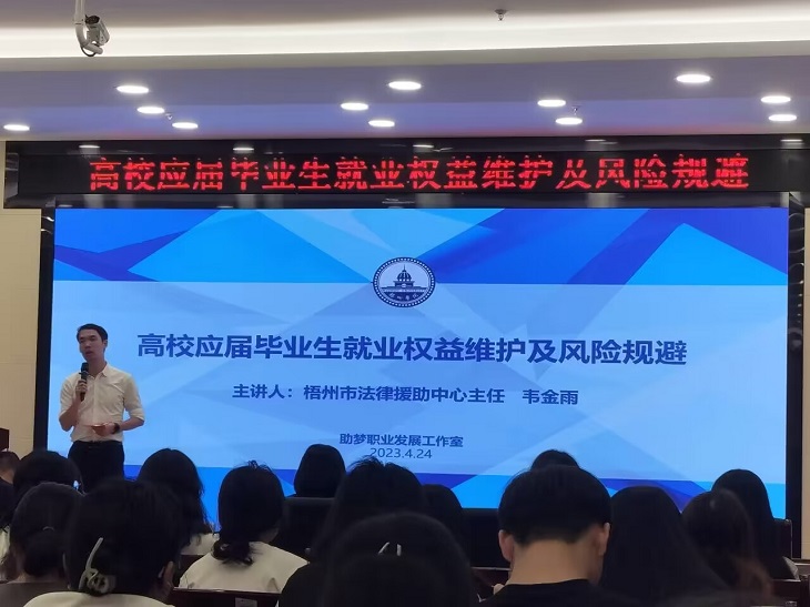 为进一步增强应届毕业生法律意识,维护自身在实习求职中的权益,商学院与助梦职业发展工作室于4月24日在明科楼一楼K101报告厅联合举办高校应届毕业生就业权益维护及风险规避讲座。商学院党委副书记叶子琛、梧州市法律援助中心主任韦金雨以及法律援助讲师团成员出席活动。