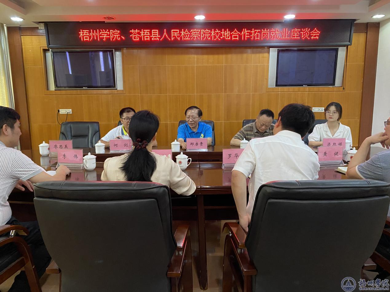 调研组一行首先来到苍梧县人民检察院,并与党组书记、检察长罗华庆、相关部门负责人及校友代表进行座谈。邱房贵副校长首先介绍我校毕业生的基本情况,希望双方深化合作,畅通招聘信息共享渠道,实现人才供需精准对接。罗华庆向调研组介绍了苍梧县人民检察院的基本情况,并对梧州学院的支持表示衷心感谢,希望今后继续加强合作。双方就毕业生就业、人才培养、学生实习等内容开展深入交流。