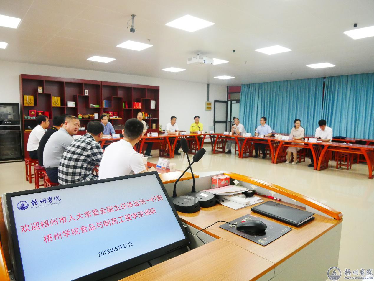 5月17日,梧州市人大常委会副主任徐远洲一行8人到我校食品与制药工程学院调研。双方在科技楼K1512进行座谈交流,食品与制药工程学院领导班子和教师代表参加座谈会。