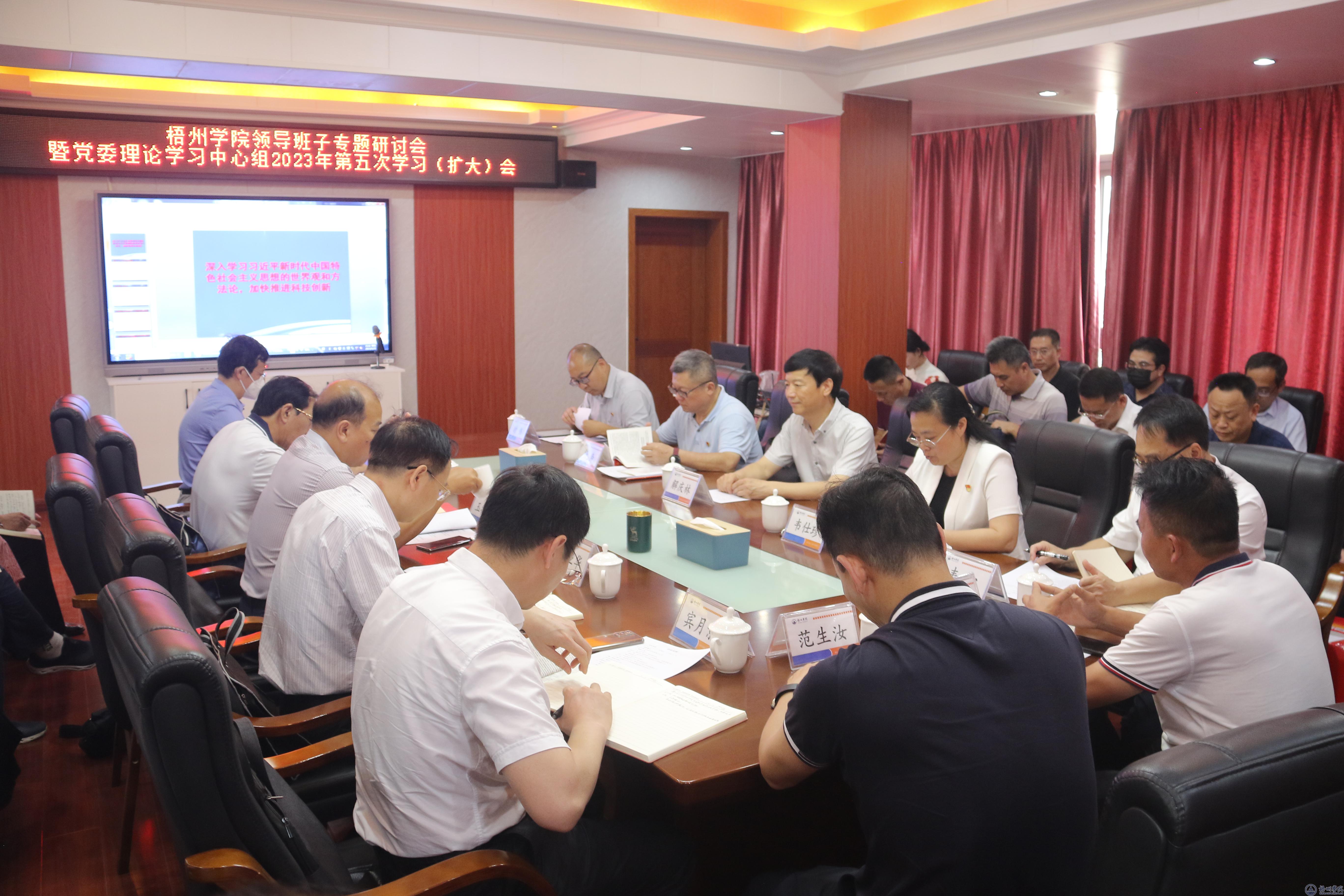 5月25日下午,学校在梧州市摩天茶海实训基地召开学校领导班子专题研讨学习会暨党委理论学习中心组2023年第五次学习(扩大)会。学校领导韦仕珍、杨奔、玉振明、邱房贵、梁业华、麻新纯、宾月景、范生汝出席会议。自治区第十二巡回指导组组长解庆林、梧州市政协副主席韦宁、梧州职业学院党委书记时伟列席指导。会议围绕“牢记领袖嘱托,创造性推动学校高质量发展”主题展开研讨。学校党委书记韦仕珍主持研讨会并讲话。