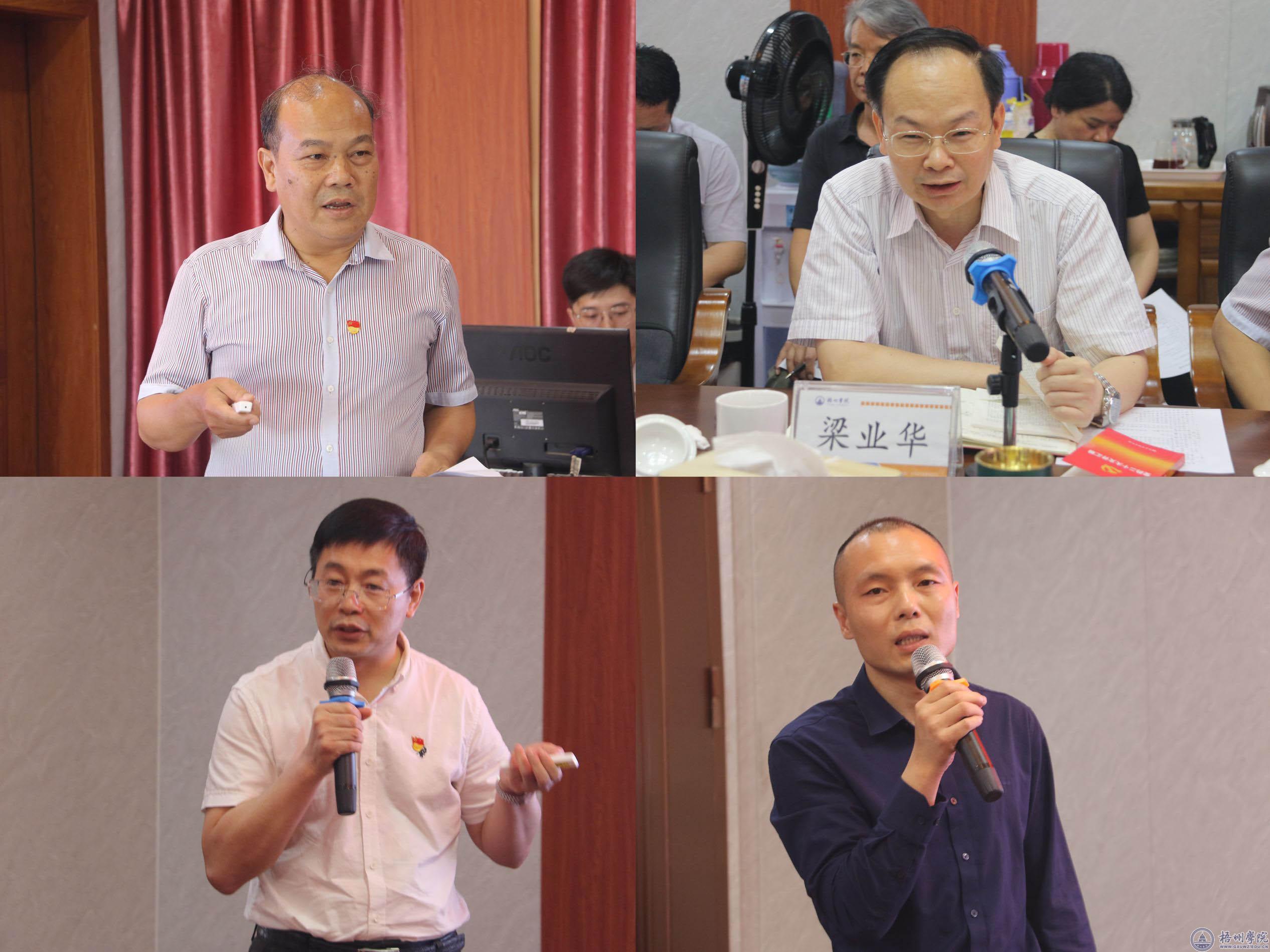 学校副校长玉振明、纪委书记梁业华、副校长宾月景、教务处处长方勇围绕主题依次发言。玉振明副校长通过“六个坚持”,详细解读了习近平新时代中国特色社会主义思想的世界观和方法论,希望把学习成果转化为提升学校科研水平,加快科技创新的强大动力,推动校地协同发展,提升服务地方经济发展能力。学校纪委书记梁业华领学了《习近平新时代中国特色社会主义思想学习纲要》中“办好人民满意的教育”的部分内容,并全面分析了当前我校毕业生留梧率不高、学生就业难等问题的原因,从加强思想政治教育、提高实践能力、对接区域产业发展等方面提出问题解决的策略。宾月景副校长结合学校学科建设、师资队伍建设、人才培养、教育评价、科技创新等情况,从九个方面解读了习近平总书记对教育工作重要论述和党的二十大报告对高等教育发展重要论述的相关内容。教务处处长方勇结合学校的发展实际,通过以“学”带头、以“研”为要、以“用”为本几个方面,提出了运用习近平新时代中国特色社会主义思想推进学校教育教学综合改革,推动我校应用型人才培养高质量内涵式发展的建议。