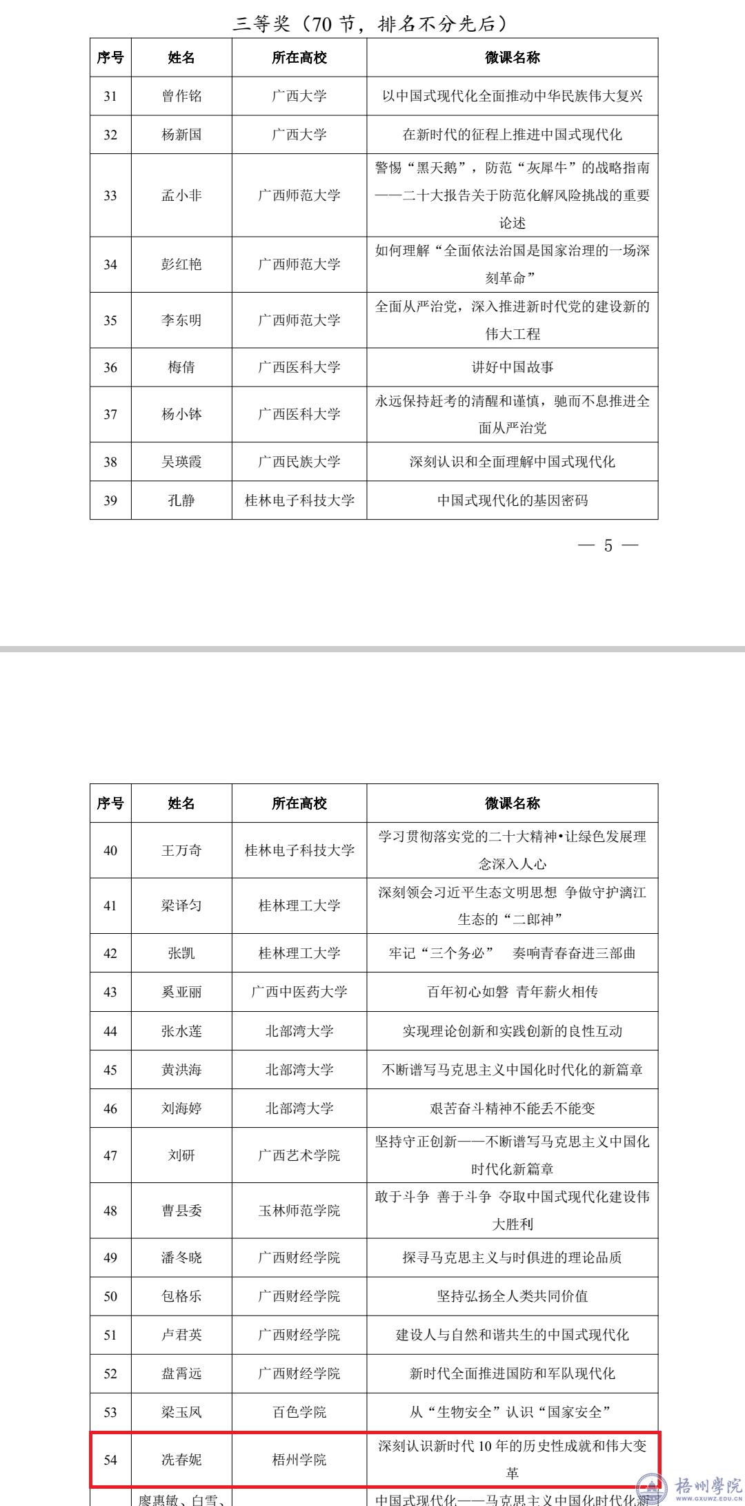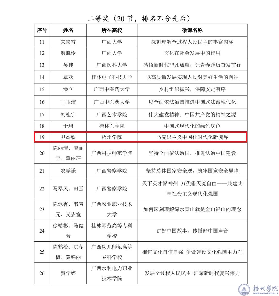 近日,广西教育厅发布了《全区高校思政课教师讲党的二十大精神优秀微课评选活动获奖名单的通知》(桂教思政[2023]4号)。据悉本次活动共有229节微课参赛,我校马克思主义学院院长尹杰钦教授的《马克思主义中国化时代化新境界》微课获二等奖,冼春妮老师的《深刻认识新时代10年的历史性成就和伟大变革》微课获三等奖。