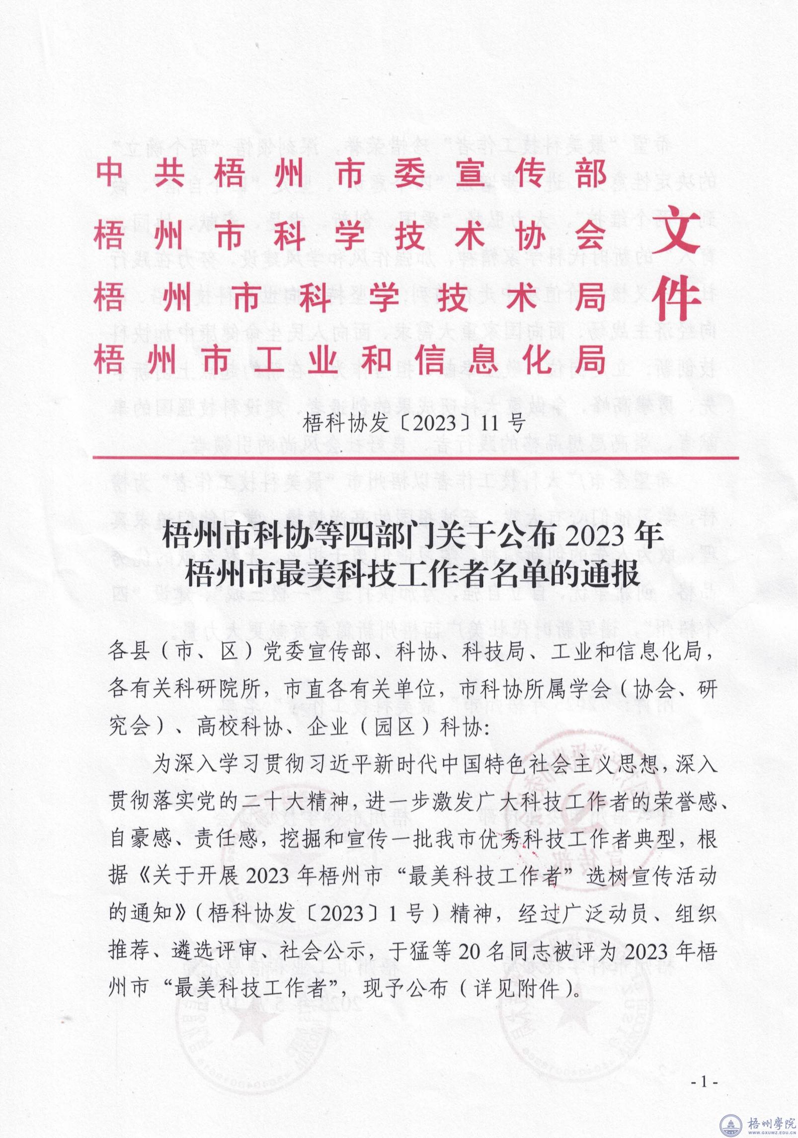 近日,梧州市科协等四部门公布2023年梧州市最美科技工作者名单,我校教师邓小林荣获“梧州市最美科技工作者”称号。