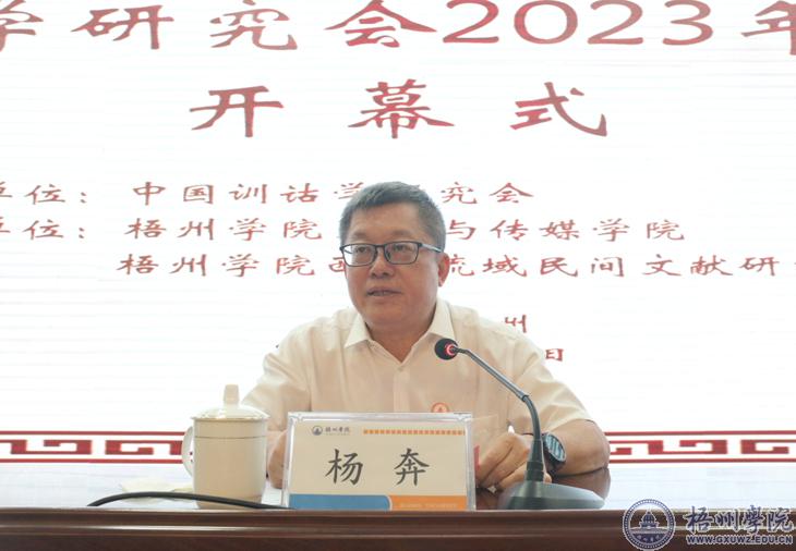 开幕式由中国训诂学研究会副会长、北京语言大学华学诚教授主持。梧州学院校长、西江流域民间文献研究中心主任杨奔教授,梧州市政协副主席韦宁,中国训诂学研究会会长、浙江大学王云路教授分别致辞。学术委员会主任北京语言大学董志翘教授,副会长浙江大学虞万里教授、东南大学王华宝教授在主席台就坐。