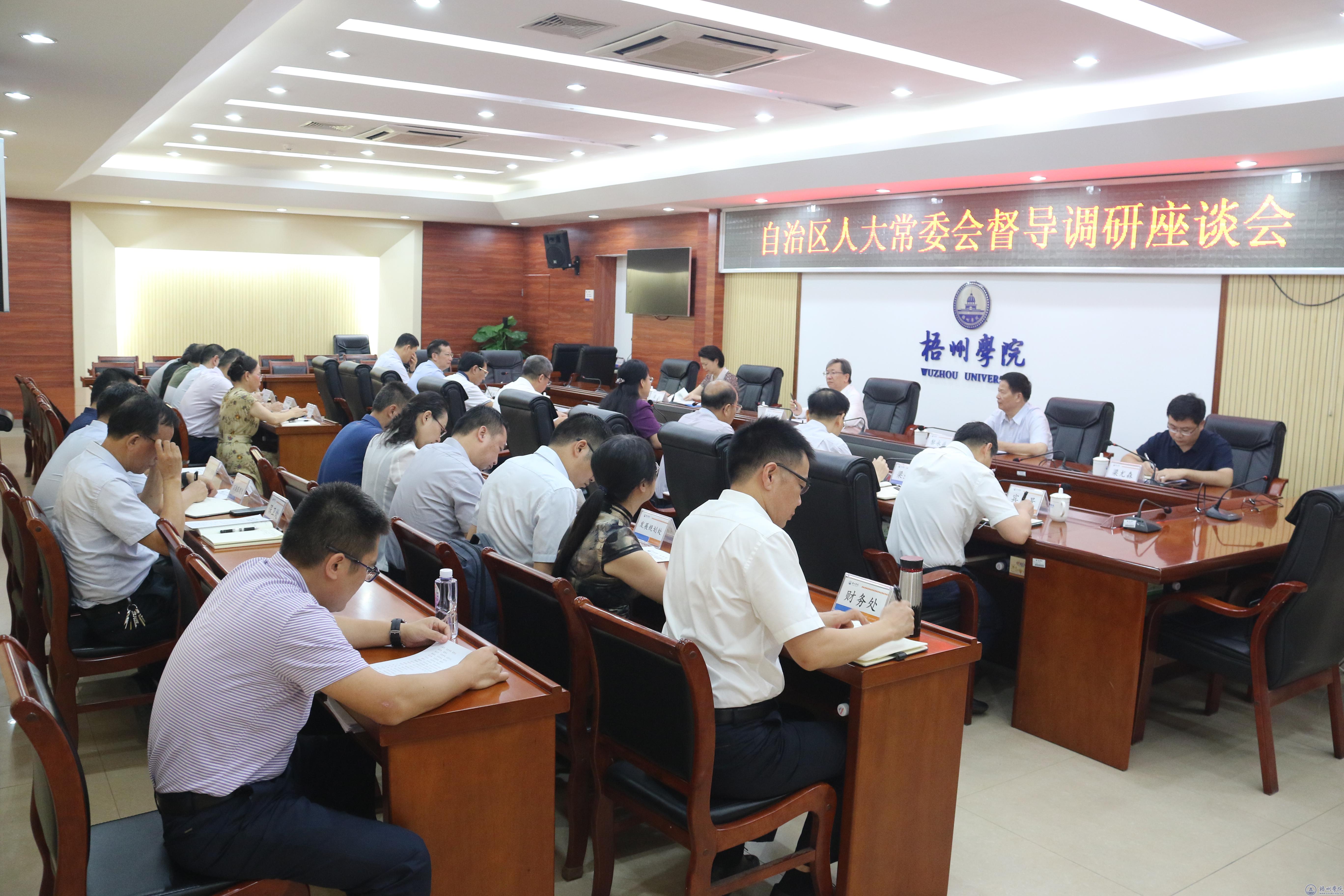 自治区人大常委会、梧州市人大常委会以及学校相关单位、部门负责人参加了调研座谈会。